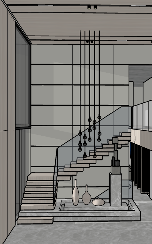 render a modern minimalistic interior featuring a floating staircase with glass railings use a neutral color palette of soft grays and whites for the walls and light natural wood ceiling add a polished concrete floor in a light gray tone the steps should have a wooden finish with a light oak color include sleek black metal railings for the staircase place elegant matte ceramic vases in muted earth tones on the base platform suspended lighting fixtures should be minimalist in matte black creating a sophisticated atmosphere the ambiance should be serene with soft natural light streaming through large glass panels casting gentle shadows on the surfaces