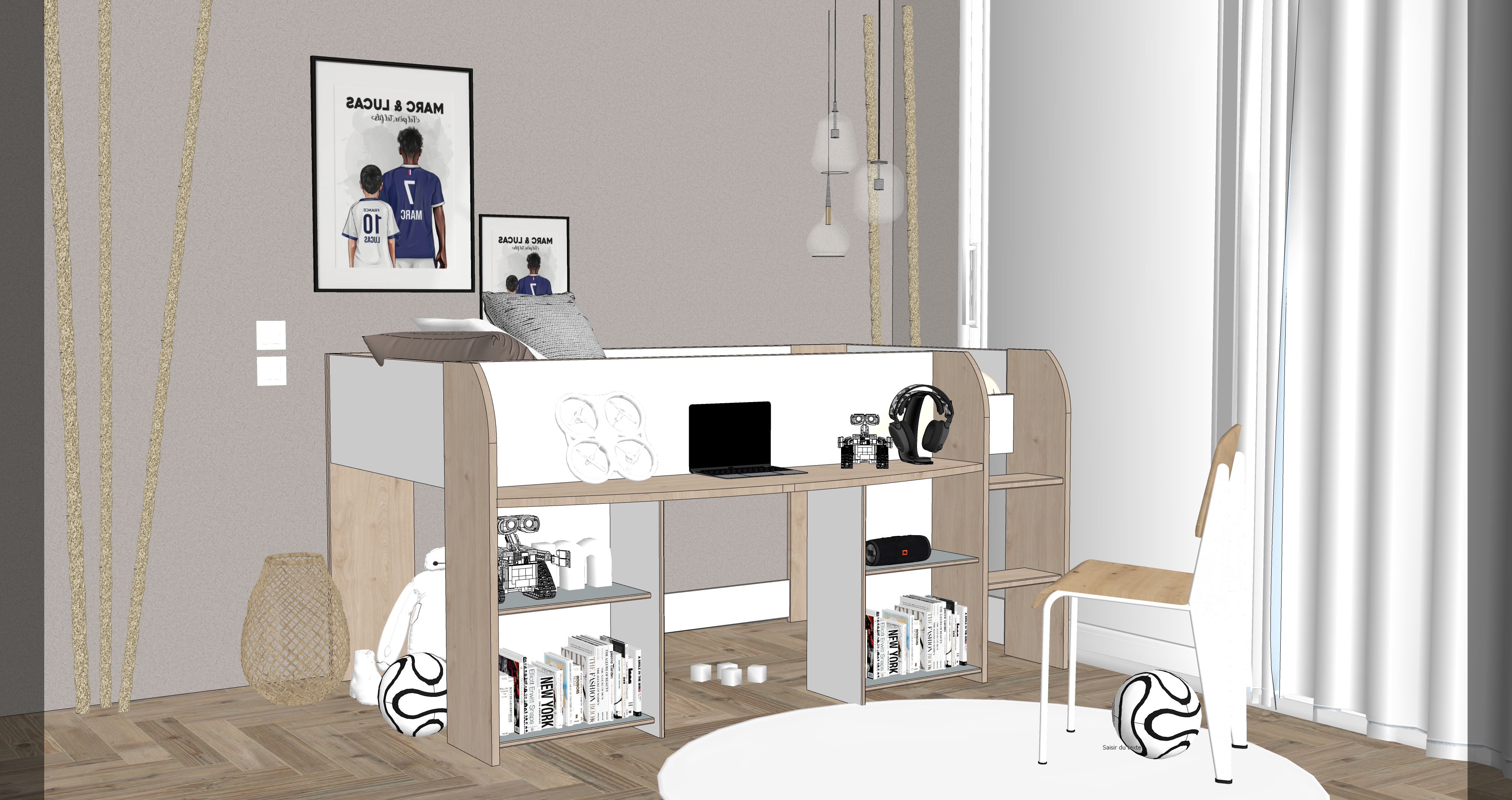chambre d enfant chaleureuse et moderne ambiance douce et naturelle espace principal compos d une alc ve en bois clair int gr e dans un meuble mural blanc avec des tag res remplies de livres jouets en bois et paniers en fibres naturelles guirlande lumineuse d licate accroch e sous les tag res clairage doux et cosy au sol tapis rond tress beige mur avec texture de terre cuite lampe rafia en haut de l image pour clairer la pi ce dans la pi ce une fen tre apportant une lumi re naturelle douce petit train en bois pos sur le tapis palette de couleurs naturelles beige blanc bois clair teintes douces et apaisantes style scandinave chaleureux et minimaliste