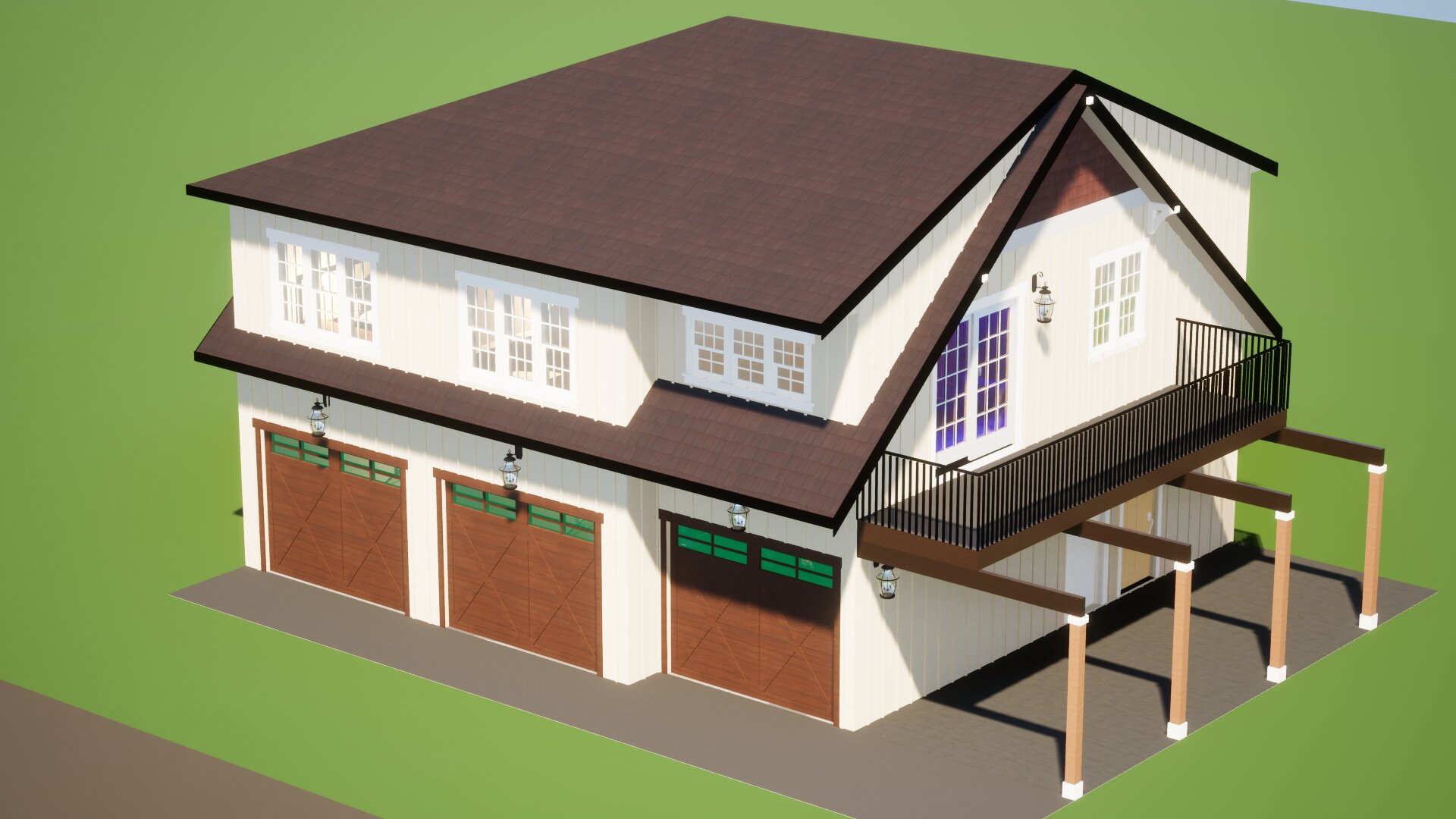 exterior shot create a high fidelity architectural rendering of the provided drawing in a contemporary modern farmhouse style matching the visual quality proportions colour palette lighting and materials of the reference image the final result should appear as if it belongs to the same design series overall style requirements clean bright minimal modern farmhouse aesthetic white vertical board and batten siding for the main wall surfaces accents of natural wood warm honey to medium chestnut tones on porch columns beams and selected trim dark matte finishes for contrast elements such as garage doors window frames roof metals and lighting fixtures balanced symmetry where the drawing allows crisp refined lines with no clutter roof massing match original image pitch in architectural shingles dark charcoal or near black secondary roof elements may include shed or secondary gable forms include a metal roof section matte black or dark bronze over the porch or secondary volume ensure eaves and gable overhangs are clean and proportional modern farmhouse standard 16 siding materials primary material white vertical board and batten siding secondary material cedar shakes for optional accent areas natural wood posts and railings with visible grain but smooth refined finish optional brick base light warm grey if the drawing includes a foundation expression windows doors multi pane black modern farmhouse windows with wide muntin bars double or triple window groupings for symmetrical upper storey massing same as reference image front entry natural wood door with a modern glass insert warm tone similar to porch columns garage doors dark cross buck farmhouse style in brown or charcoal lighting exterior fixtures use classic modern farmhouse gooseneck or lantern sconces in matte black place them symmetrically on either side of garage doors and near entry doors use the reference image as a guide porch architectural details full width or partial width covered porch depending on the drawing s layout wood posts spaced evenly slightly tapered or square clean porch steps in wood or concrete matching the warm farmhouse palette subtle lattice or vent detailing below the porch white driveway landscaping gravel driveway minimal manicured landscaping trimmed round boxwood shrubs clean green lawn and a few background trees ensure the landscaping does not overshadow the architectural detail lighting mood rendering quality late afternoon natural lighting soft warm directional light gentle shadows blue sky with soft clouds optional birds for realism photorealistic material rendering accurate reflections on metals soft shadow falloff crisp edge definition high resolution magazine quality real estate rendering camera composition eye level camera approx 5 6 6 height straight on or slight 3 4 angle matching typical architectural promotional renderings wide lens that captures full fa ade driveway and a margin of landscape goal recreate the fa ade from the provided drawing so that it visually and stylistically aligns perfectly with the modern farmhouse example same warmth same material palette same proportions same contemporary but classic rural elegance