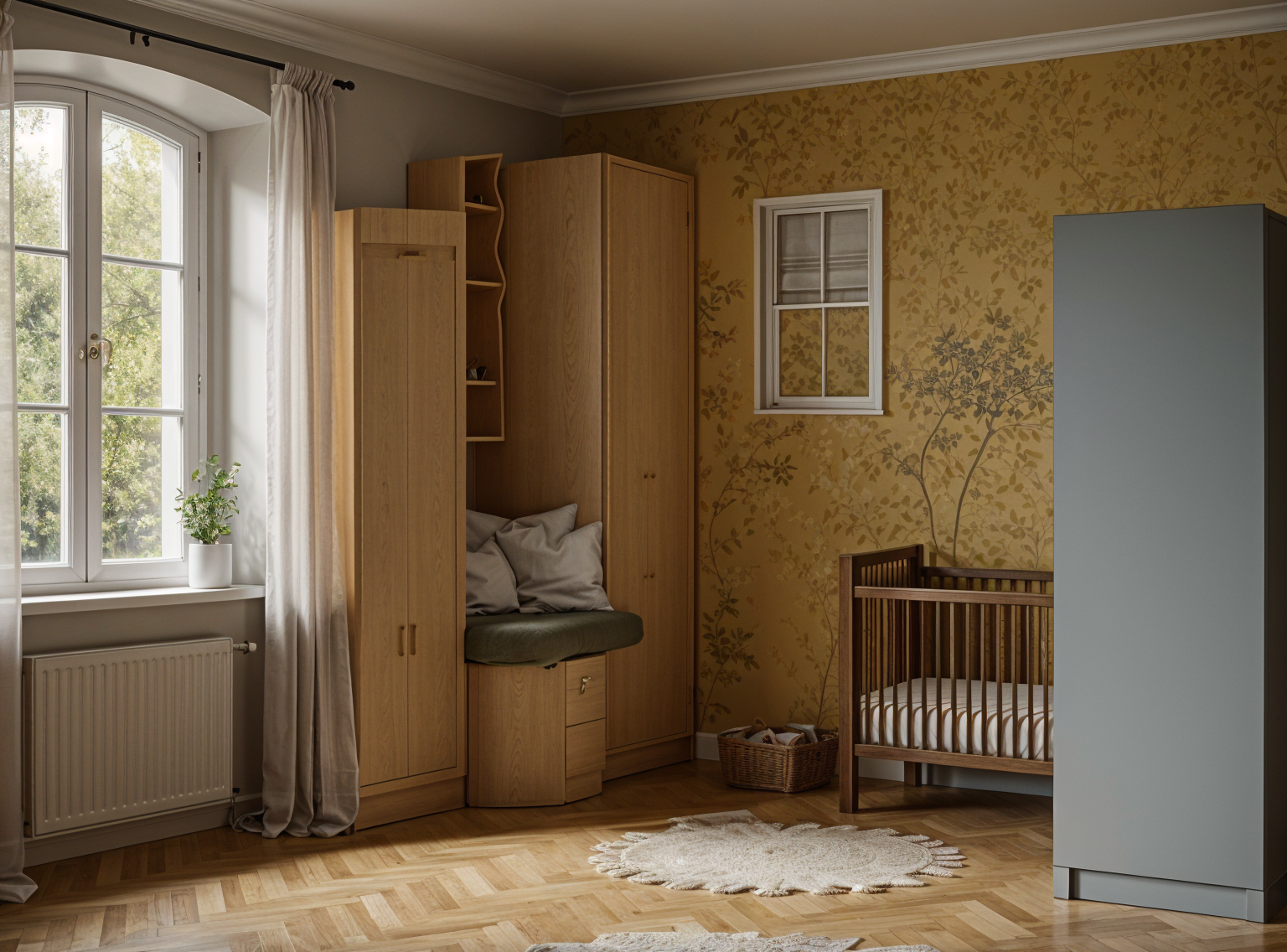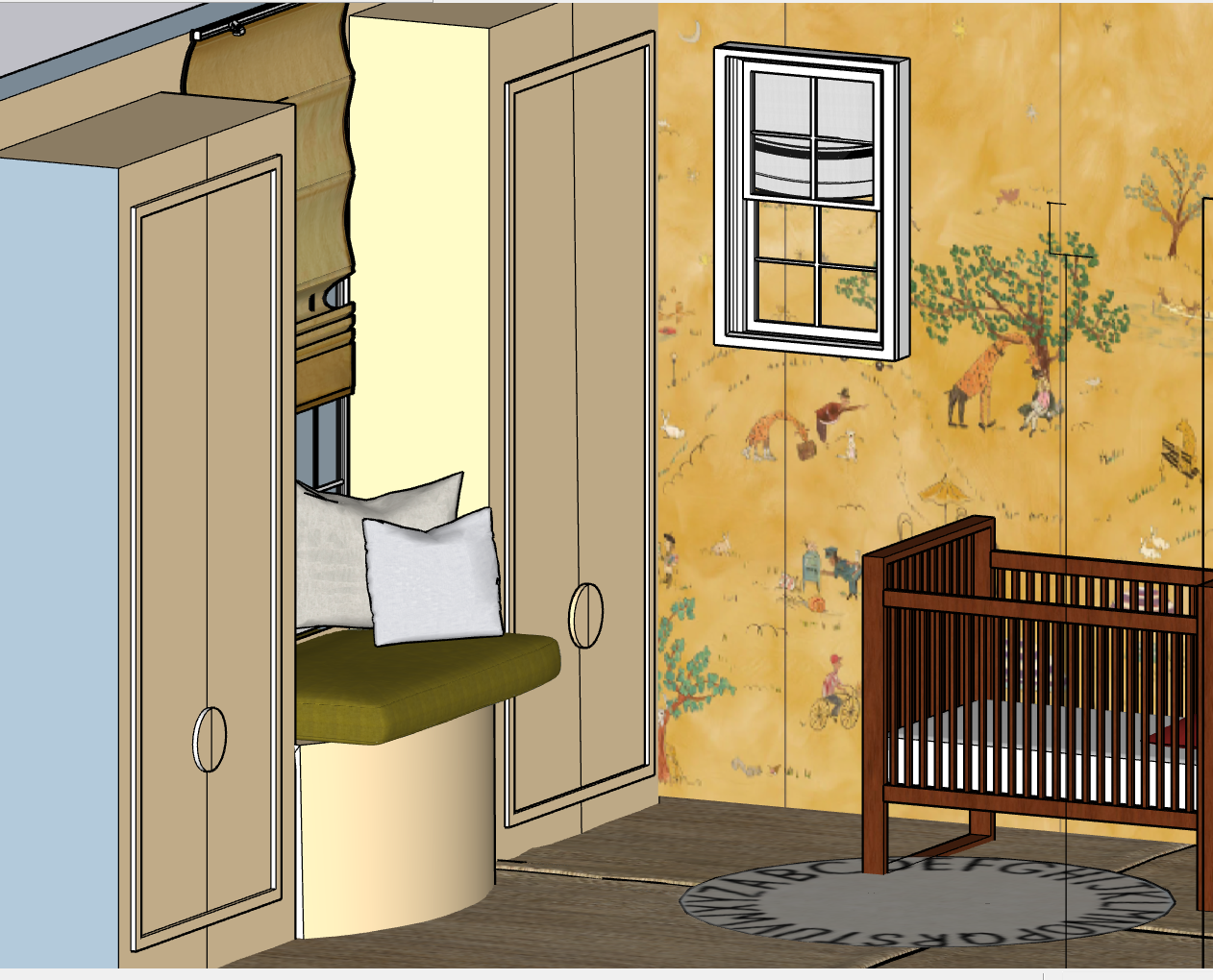 belmann inspired nursery with artists sketch wall paper warm light rounded seating nook and cushion nature in windows add roman shades to windows add round handles to doors