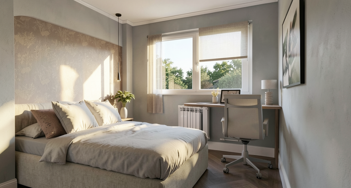 modern house in city houses around dark grey bricks light wood grass and trees around