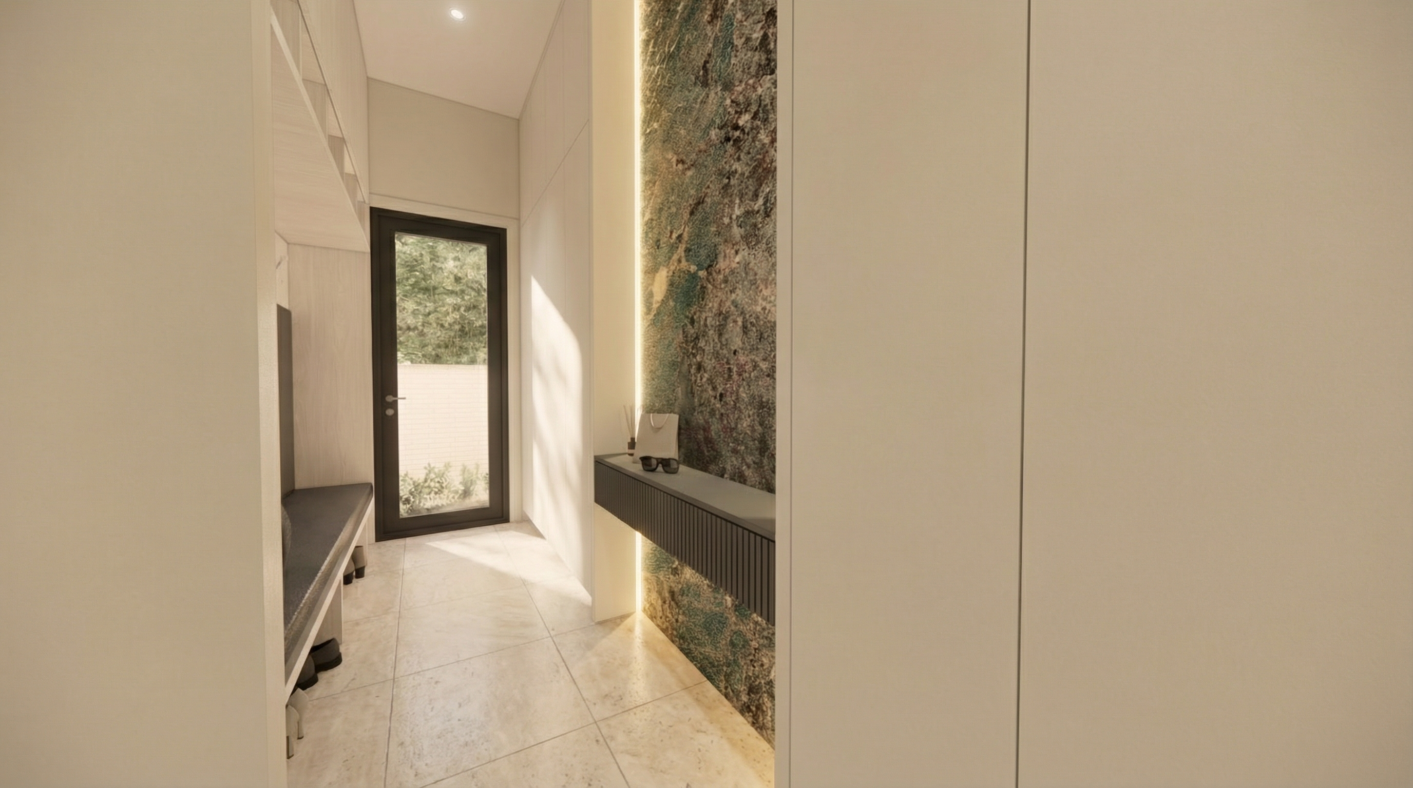 add natural lighting into this entry way make the background out the windows nice the include trees add some beautiful art on the walls there are no windows or doors beside the stairs there is a blank wall beside the stairs