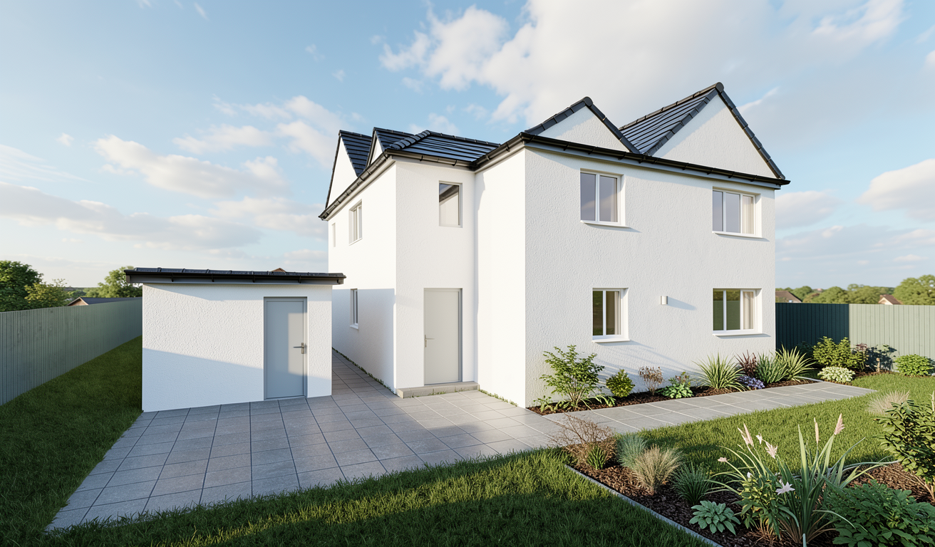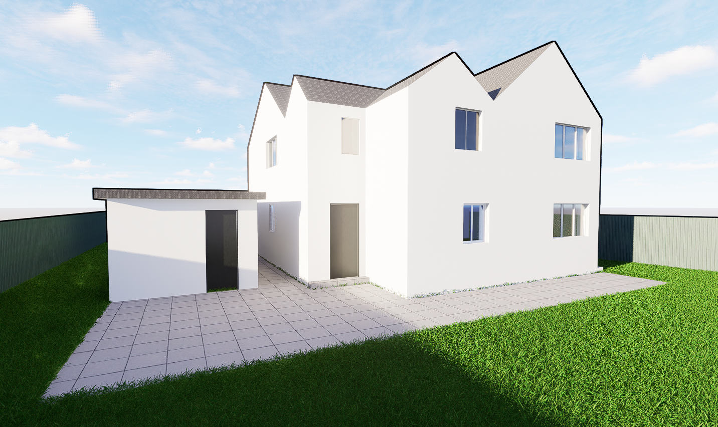make this exterior look more realistic all of the walls white render white pvc windows the doors are to be a nice light grey pvc landscape the garden with some nice grass small plants to the right and paving slabs make the roof black slate tiles with a nice fasia and soffit add some natural lighting and a nice sky