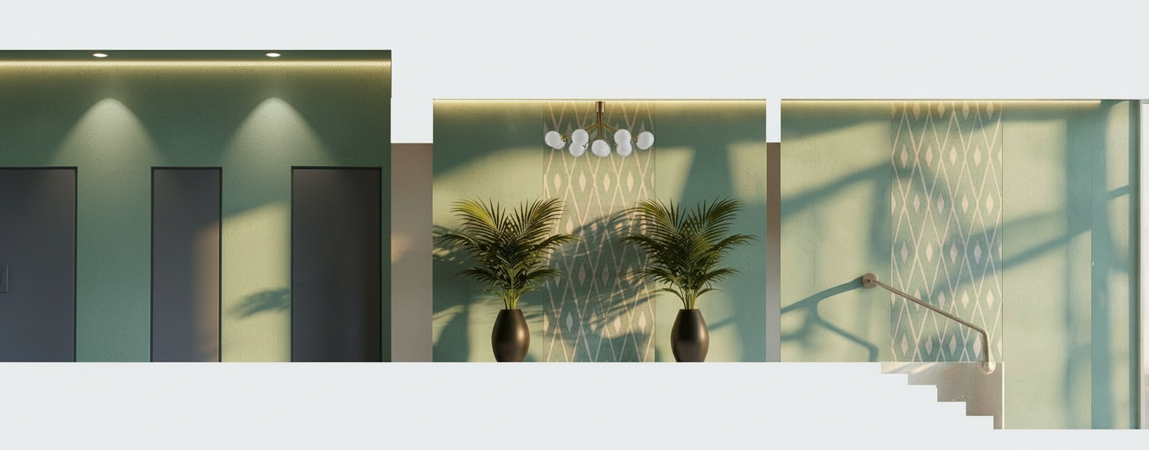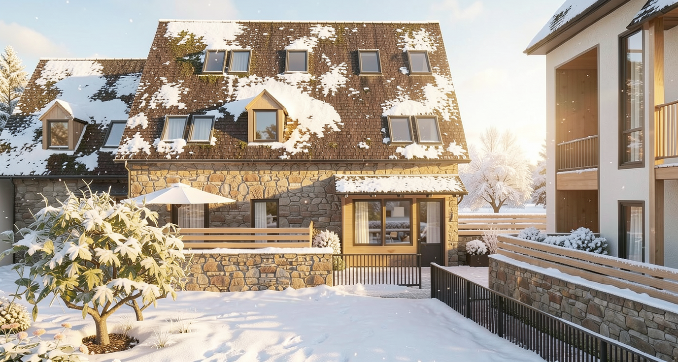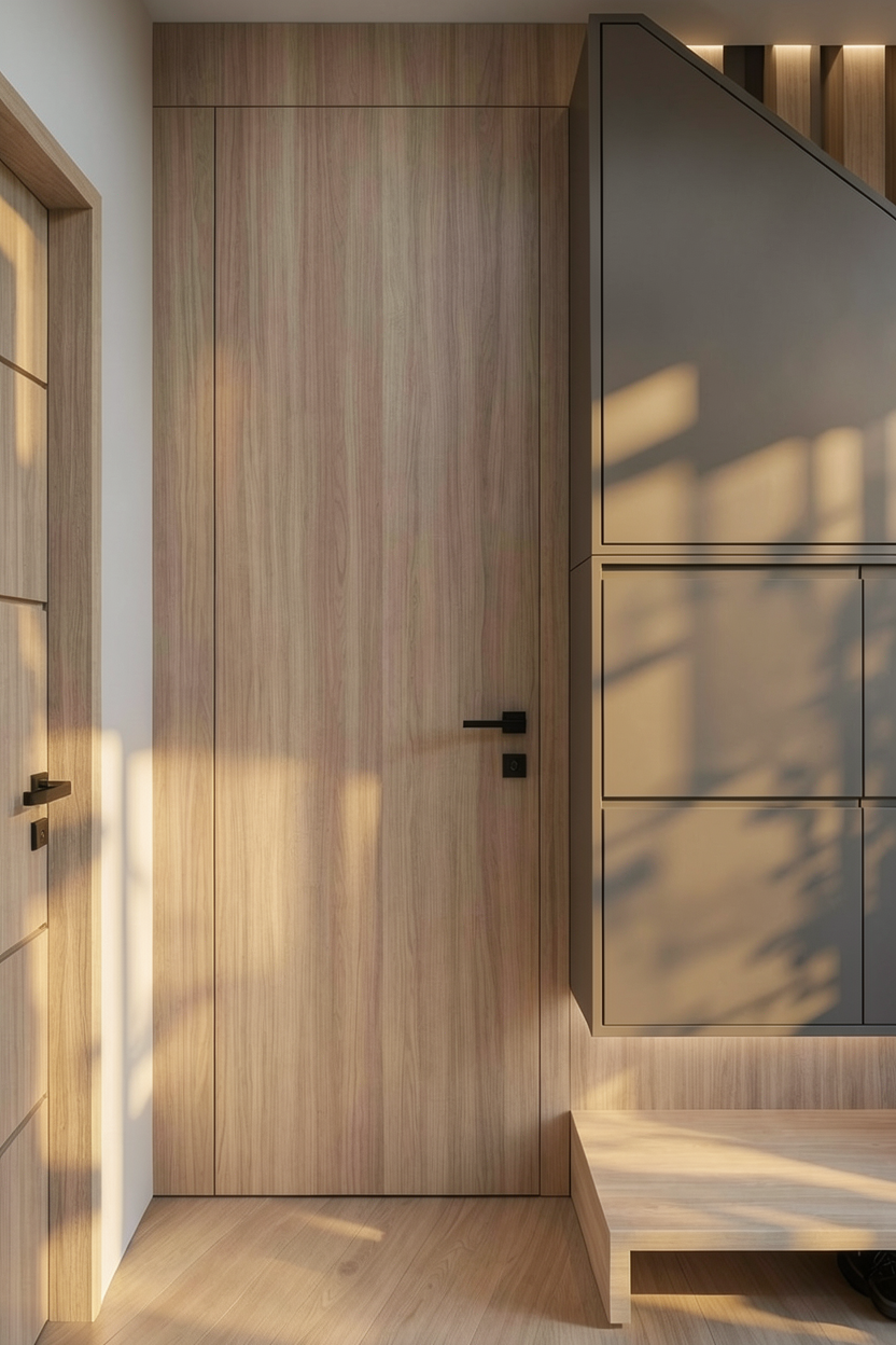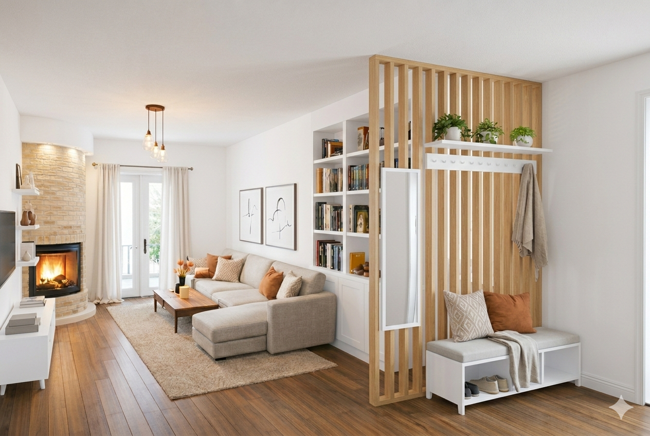 render a cozy and inviting living room with a modern scandinavian design include a light beige sectional sofa accented with soft terracotta and patterned cushions feature a wooden coffee table with a vase of fresh warm hued flowers the backdrop should be an elegant white bookcase divided by a light wood slatted partition illuminate the room with warm ambient ceiling lights create a focal point with a stone fireplace in soft beige brick with a lively fire use light brown wood flooring throughout and accentuate with a plush light beige area rug add natural greenery on the bookcase to bring a fresh touch complete with light sheer curtains framing a glass door enhancing natural light and maintaining an airy serene atmosphere