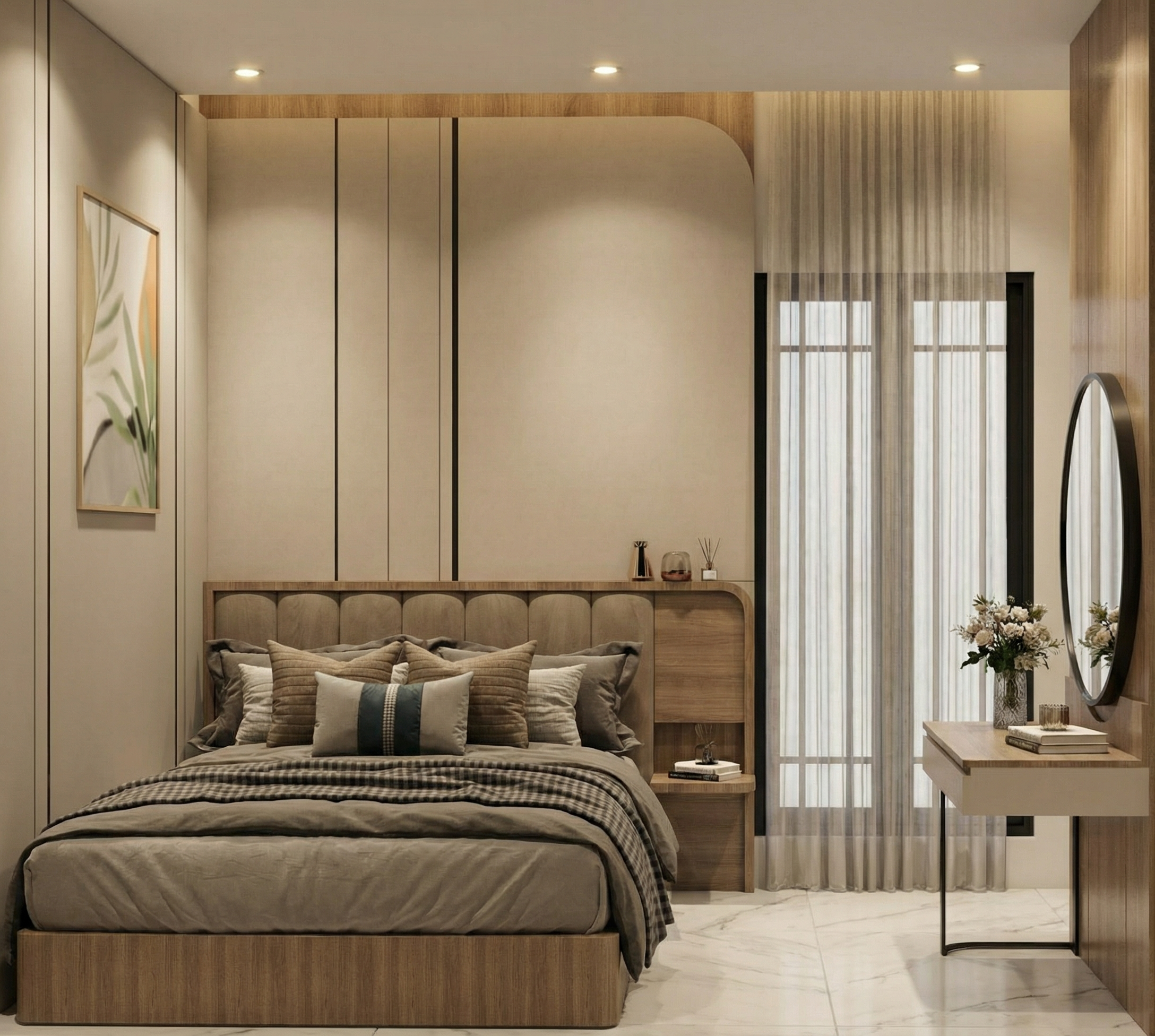 home fitness room dont change any proportion and model things front left only put brown wood material but dont change anything flor gray fitness floor and tiles light cream windows brown wood left back covered wirlpool dont change existing model new fitness panel with fitness staff light oak c shape as in model 1shelve on floor wall panel ceiling all one material oak