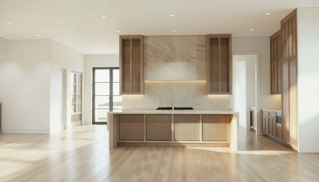 convert this architectural rendering into a highly realistic editorial style luxury real estate photograph suitable for marketing and listing imagery maintain the exact architecture layout geometry window placement and proportions exactly as modeled do not redesign restyle or modify the architecture in any way do not move walls windows fireplaces cabinetry or structural elements enhance realism only through natural lighting accurate material texture subtle reflections and soft shadow depth the image should feel like a professionally photographed architectural digest style interior used for luxury real estate marketing materials in the space include builddirect engineered wide plank flooring in seashore finish walls and ceiling painted origami white by sherwin williams the wood flooring should show authentic grain correct plank scale subtle tonal variation and a natural matte sheen walls and ceilings in origami white should appear clean soft and naturally illuminated with balanced daylight and realistic depth natural light should be softly entering through the windows in an editorial photography style creating gentle highlights natural interior bounce light and subtle shadow depth similar to high end architectural photography the furniture currently shown in the rendering should be treated as placeholders and replaced with high end restoration hardware style furnishings that feel timeless upscale and well curated furniture should remain similar in scale and placement so the architecture remains the focus add tasteful high end staging accessories such as textured neutral pillows sculptural ceramic or stone vessels refined trays and coffee table books subtle decorative objects appropriate for a luxury staged kitchen the final image should appear highly realistic refined and editorial similar to a luxury architectural digest feature or professionally photographed high end listing do not alter architecture layout geometry or materials only enhance realism and staging