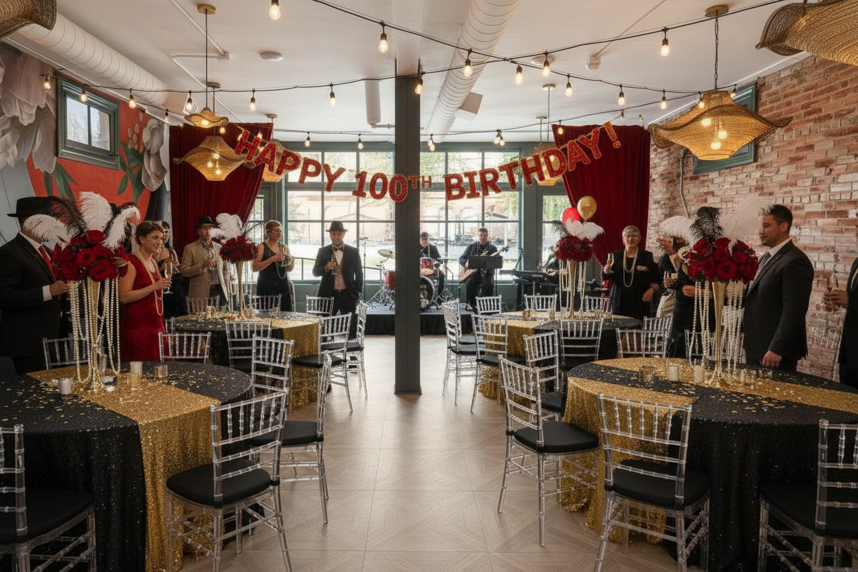 remove the existing chairs and create a roaring 20s themed birthday party with yellow and red accent colors incorporate string lights