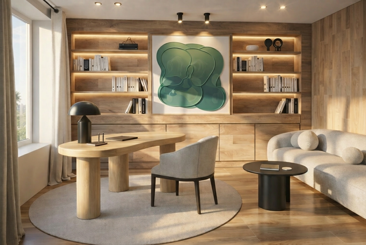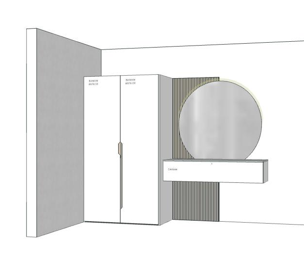 ultra photorealistic interior render based on the provided image preserve exactly the original furniture layout proportions wall positions and camera angle remove all technical labels texts and construction marks from the furniture do not modify cabinet color wood tone handle color furniture proportions wall color materials the tall cabinet must appear in matte white lacquer the wall boiserie must appear in light ash wood frassino ecru with realistic vertical slats and subtle natural wood grain the cabinet handle must have the same color and material tone as the boiserie wood enhance realism only by improving material texture and surface depth mirror round mirror with soft integrated backlighting diffuse led halo behind the mirror even and soft illumination styling add minimal entrance objects on the shelf a small decorative vase a tray for keys a small plant lighting soft neutral daylight balanced global illumination soft shadows around furniture and wall no warm color shift rendering style high end architectural photography look photorealistic materials sharp details neutral color grading
