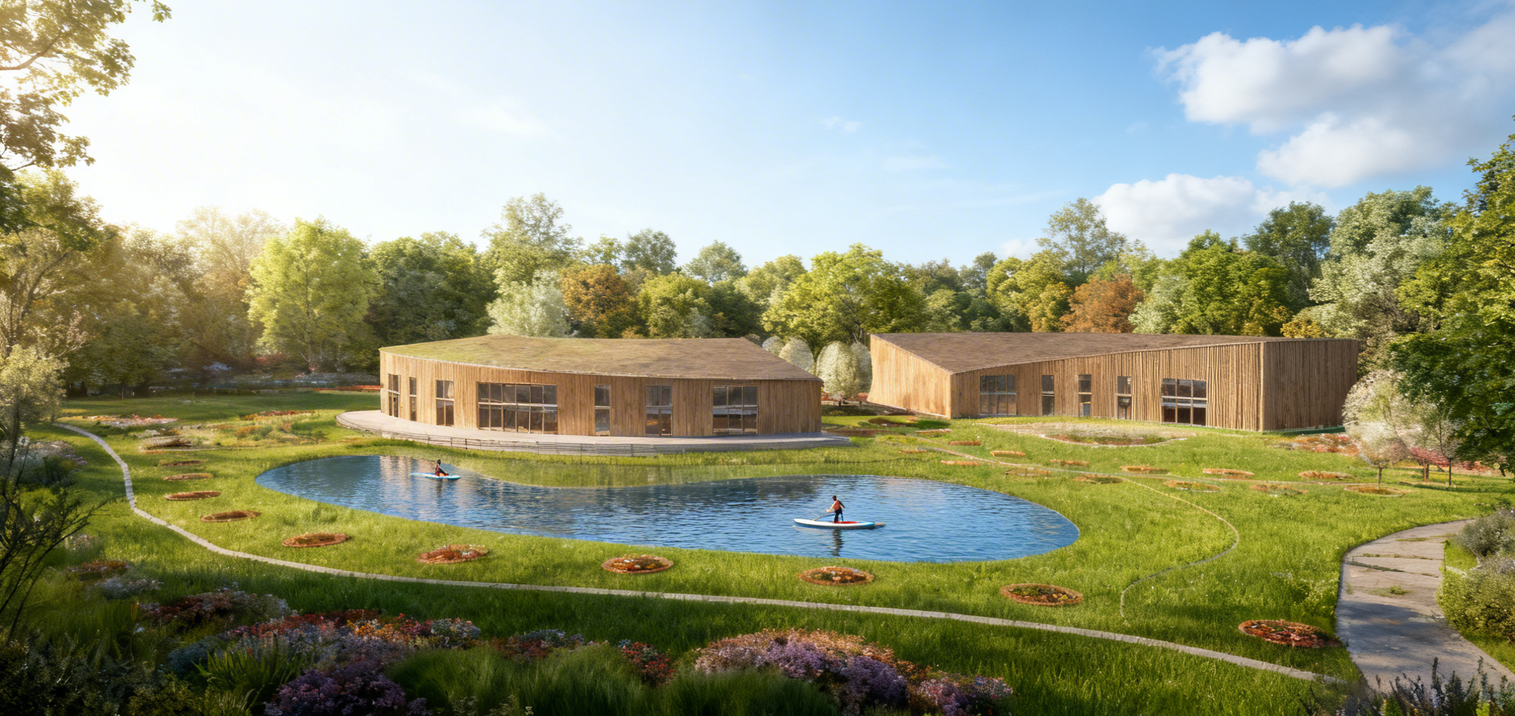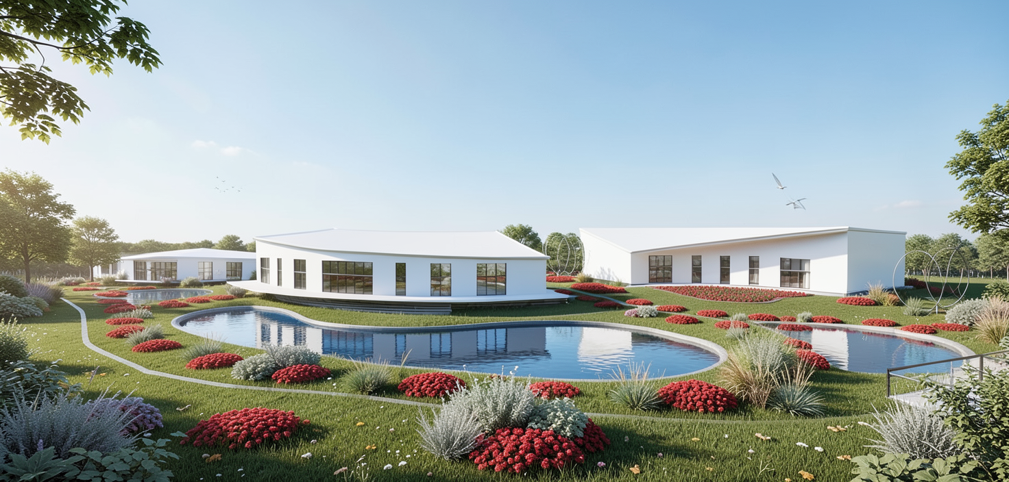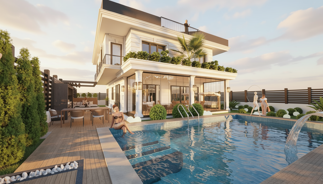 do not change the architectural design layout camera angle furniture placement or materials transform the scene into a romantic winter evening atmosphere it is nighttime with a deep navy blue winter sky soft snow is gently falling from the sky snowflakes are visible in the light beams near the garden lamps and house lights light snow has started to accumulate naturally on grass areas bushes pool deck edges pathway borders roof edges pergola and railing tops do not cover everything with thick snow snow should look fresh and soft slightly touching surfaces very realistic and thin keep the pool water unfrozen slight steam vapor should rise subtly from the pool surface due to warm water contrasting with cold winter air interior house lights must glow warmly 3000k 3500k warm light garden sphere lights should emit warm soft light and reflect gently on slightly snowy surfaces add a soft cinematic winter haze in the air lighting contrast should be realistic premium and luxurious not too dark materials must remain high quality and detailed snow should interact naturally with light and shadows no flooding no heavy storm only romantic soft snowfall ultra realistic winter night exterior render luxury villa atmosphere soft depth of field cinematic mood photorealistic