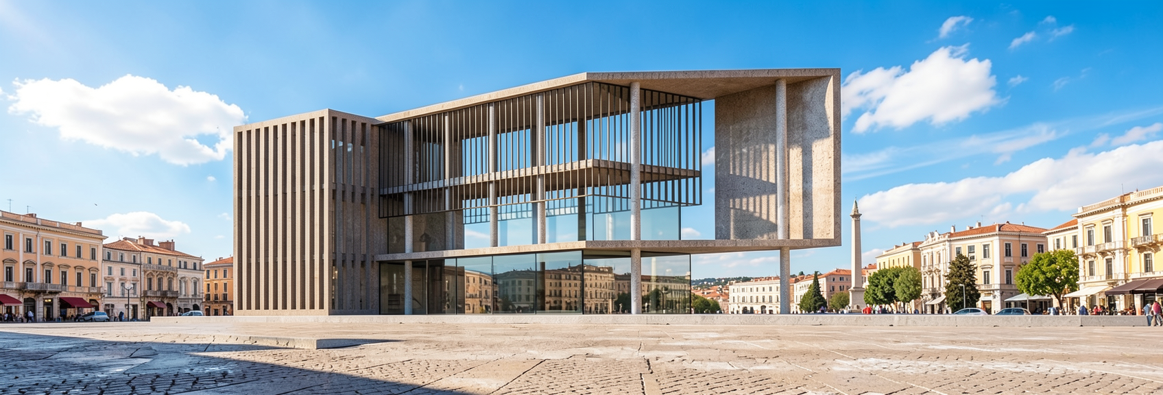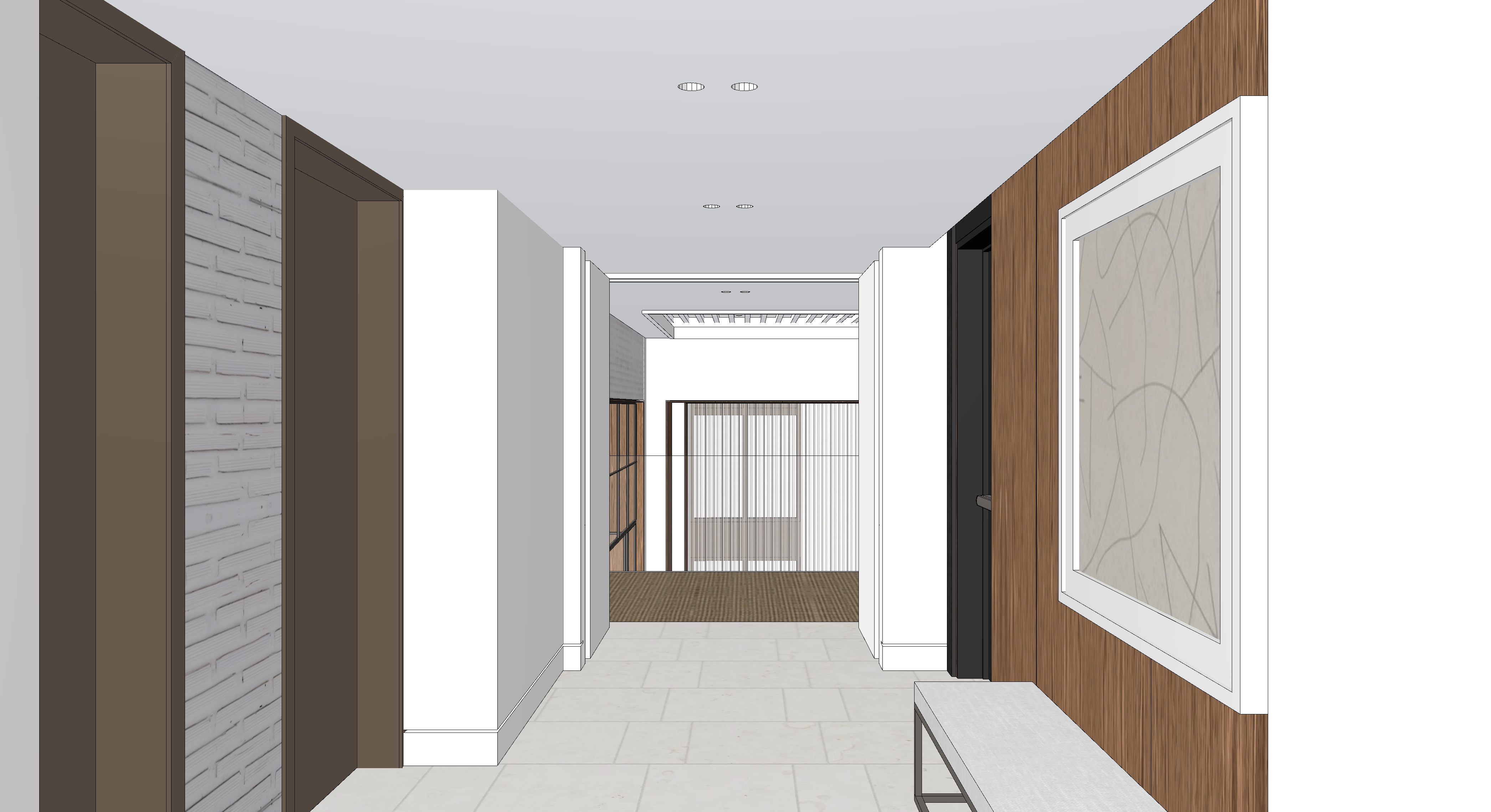 elevator lobby with dim cove lighting illuminating right side wall downlights costing pools of light on matte stone floor sheer drapery in the distance visible through a glass balustrade