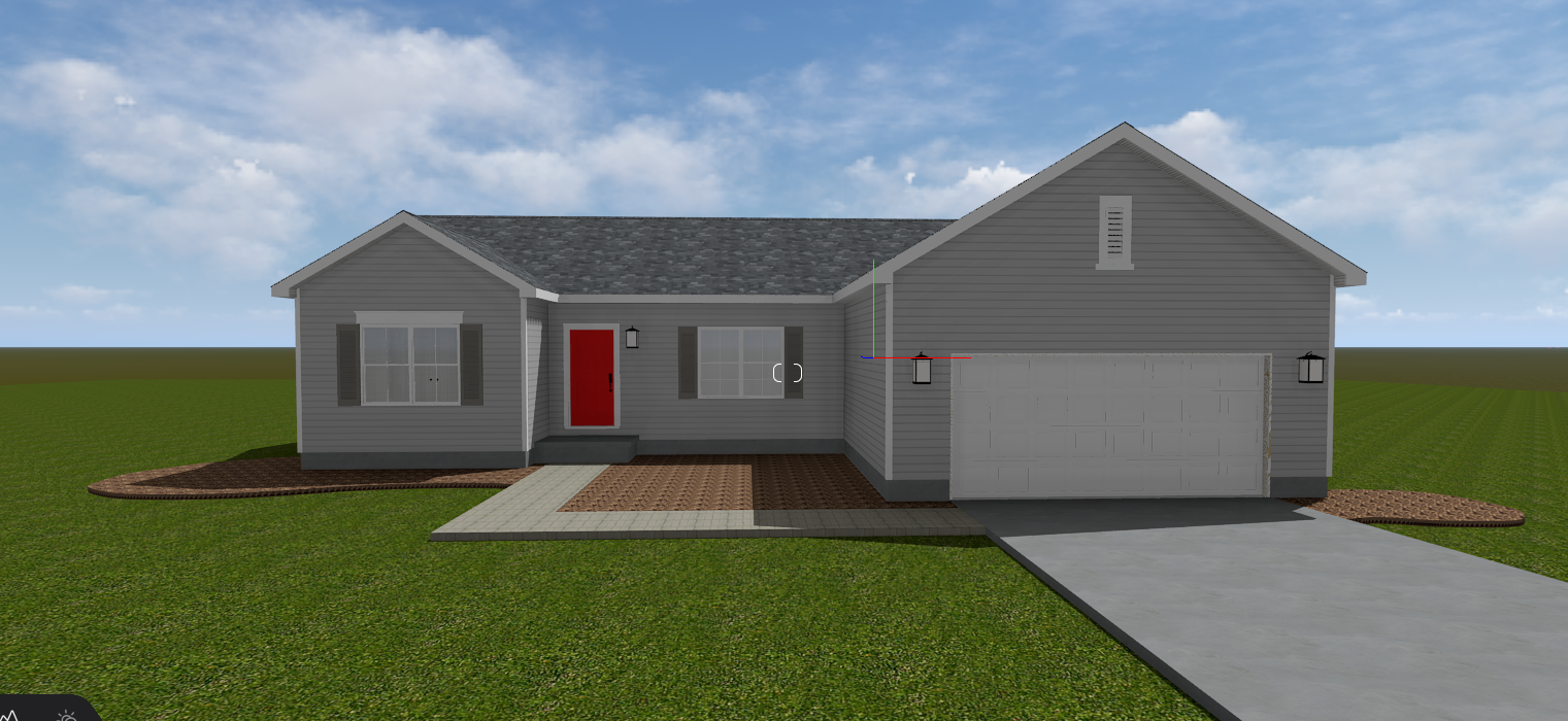 make as photorealistic as possible while keeping textures the same as selection professional landscaping in a lightly wooded scene with good lighting light grey horizontal siding dark roof