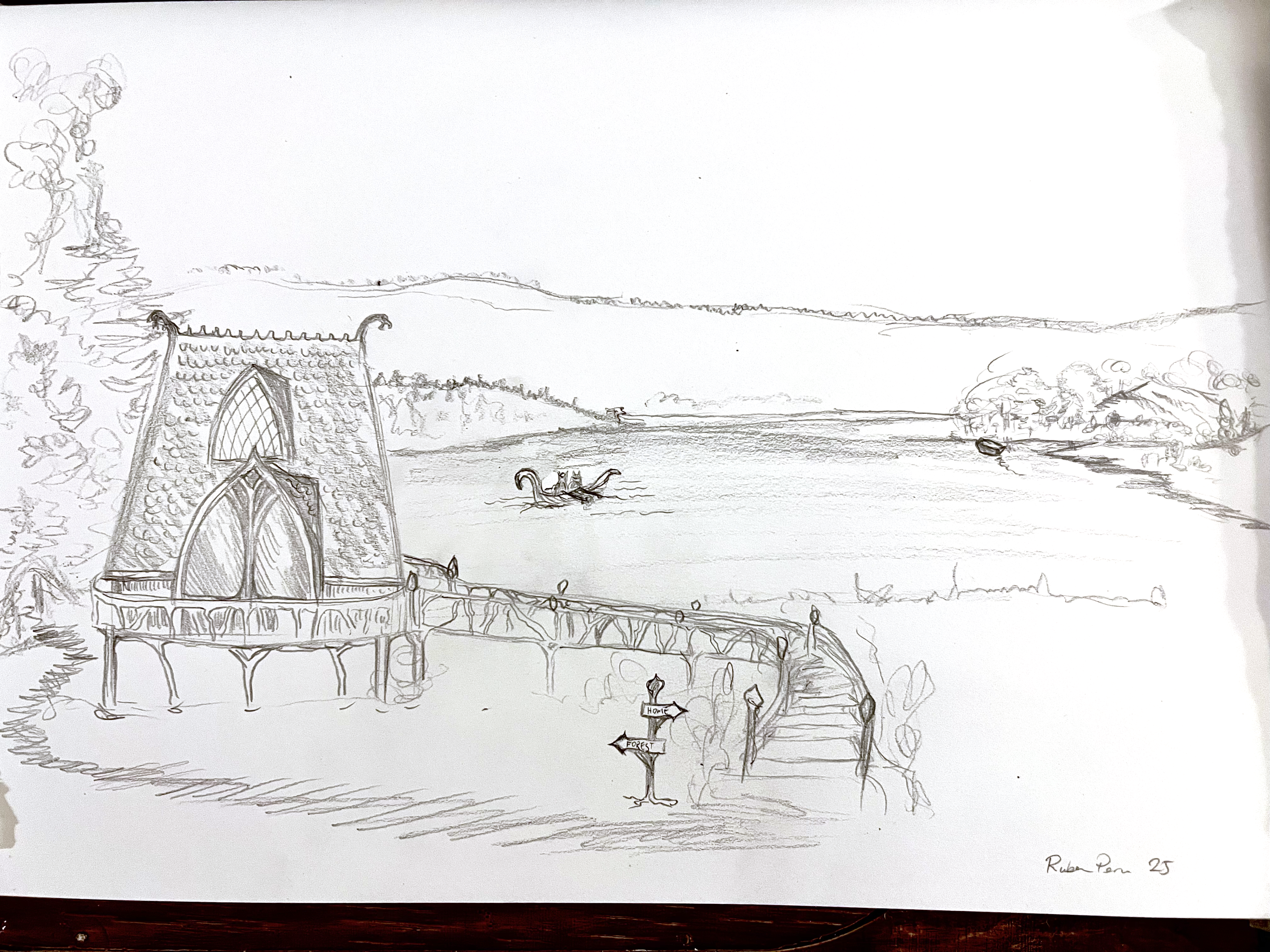 exterior shot transform the lakeside elvish house into a colored architect image in art nouveau style but with hints to norwegian stave churches and middle age architecture keep the wooden railings in an organic style as the original drawing the boat on the lake depictures a swan the hills in the background are forests with pine and spruce trees the trees to the left have leaves