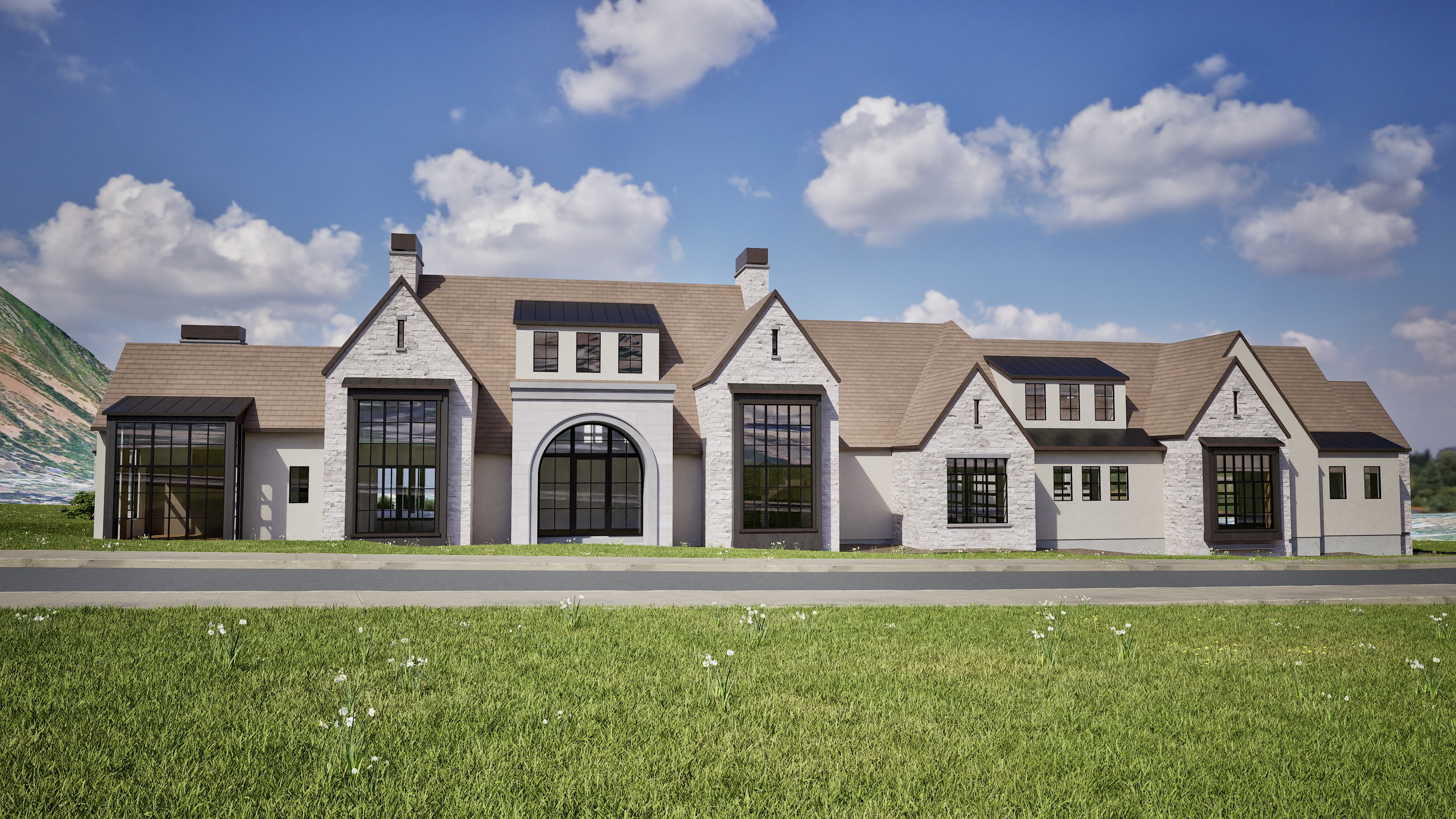 don t change the structure a modern traditional mansion made from the following materials white cream dry stacked stone veneer cream stucco a light brown beige asphalt shingle and a dark gray wood material enhance all materials to feel more realistic and natural with enhanced textures and shadows add vegetation around the exterior of the home and add plants in the foreground in front of the road and curb change the sky to be a bright noon summer vibrant day add a tree in the background on the right