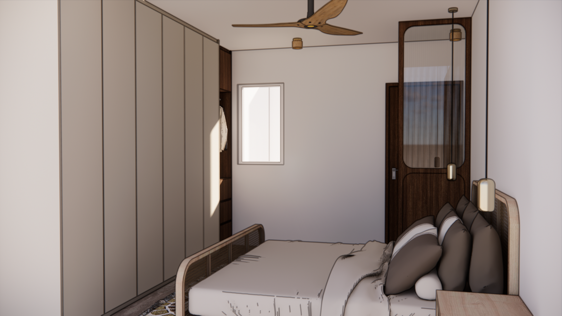 natural lighting ambience lighting keeping the existing material and render realistic bedroom render
