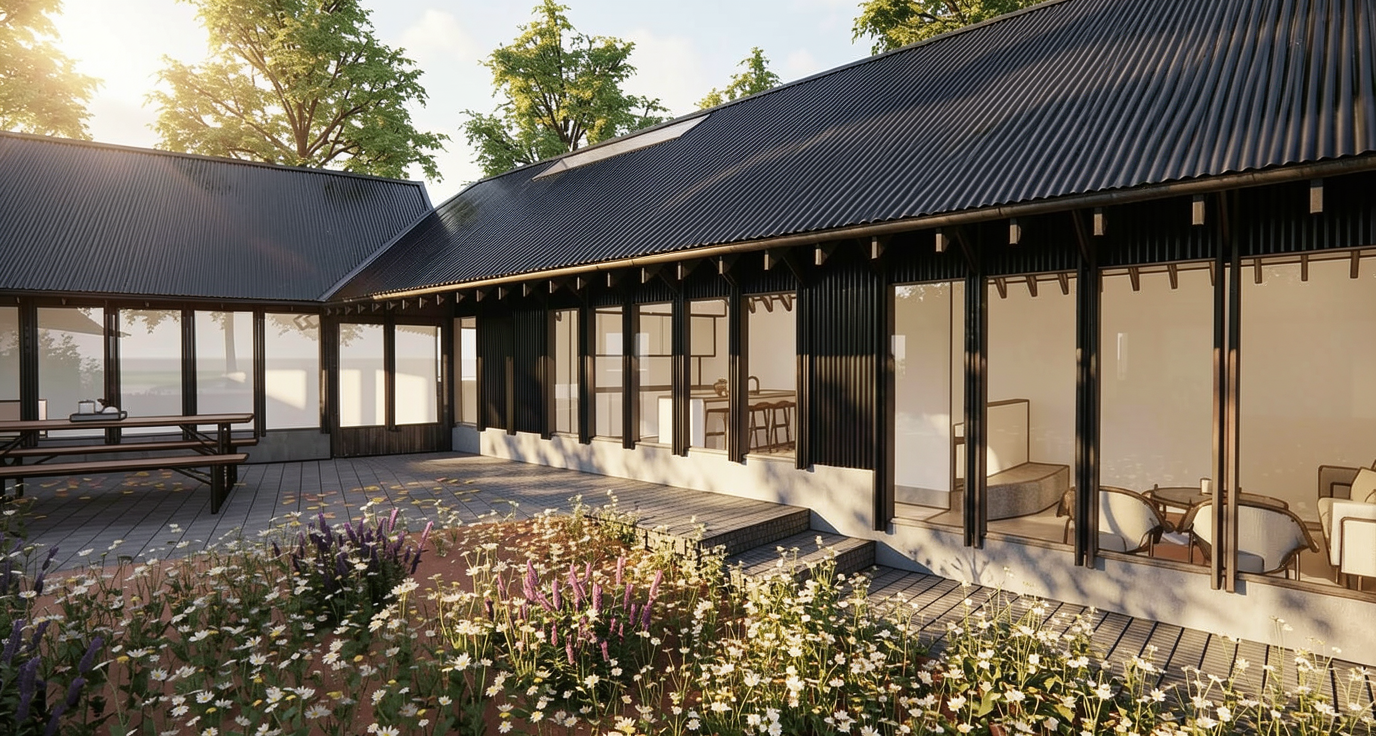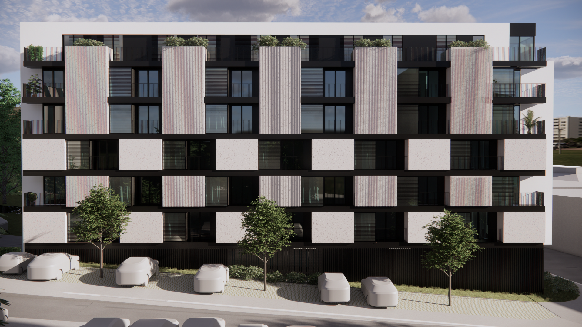 residential building keep the architecture keep the colors as they are keep the geometry keep the colors keel the vertical cladding where it is keep the day time keep the sun angle side walk realistic