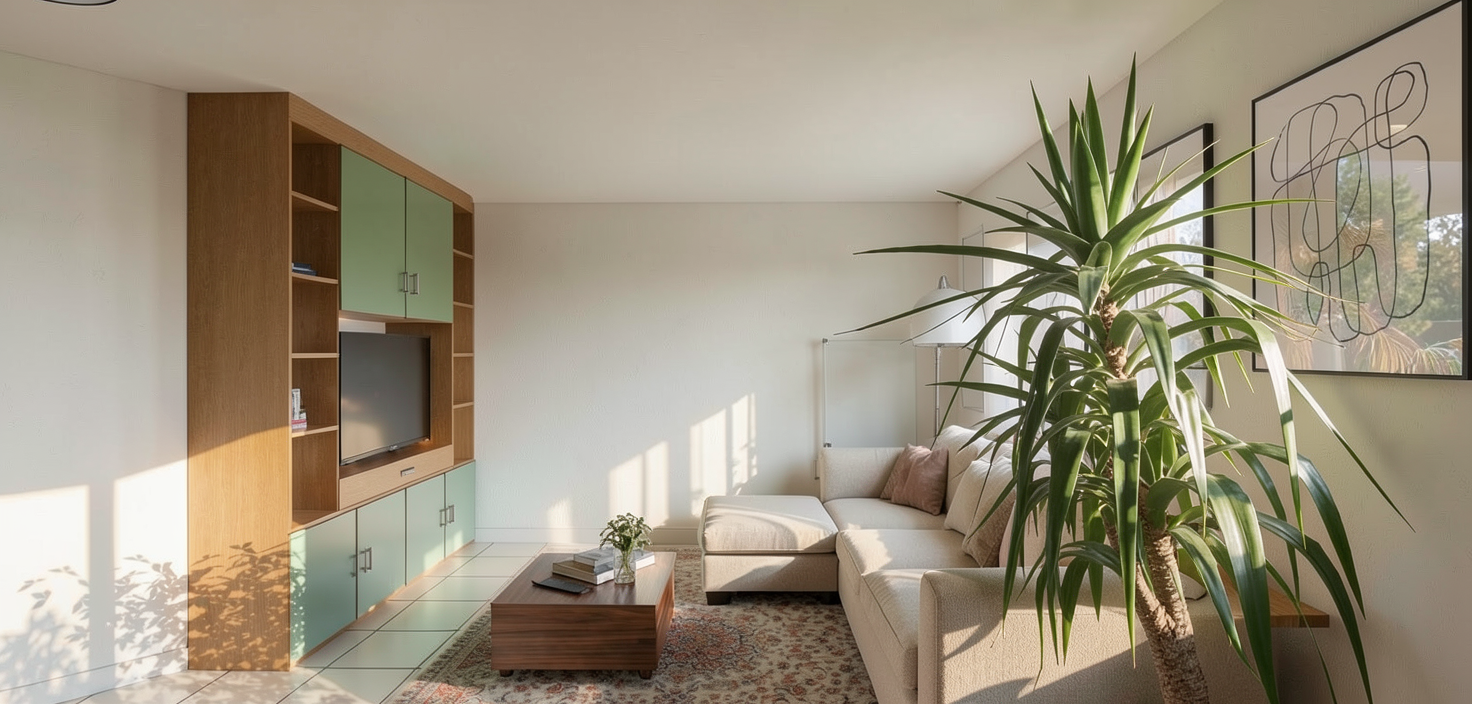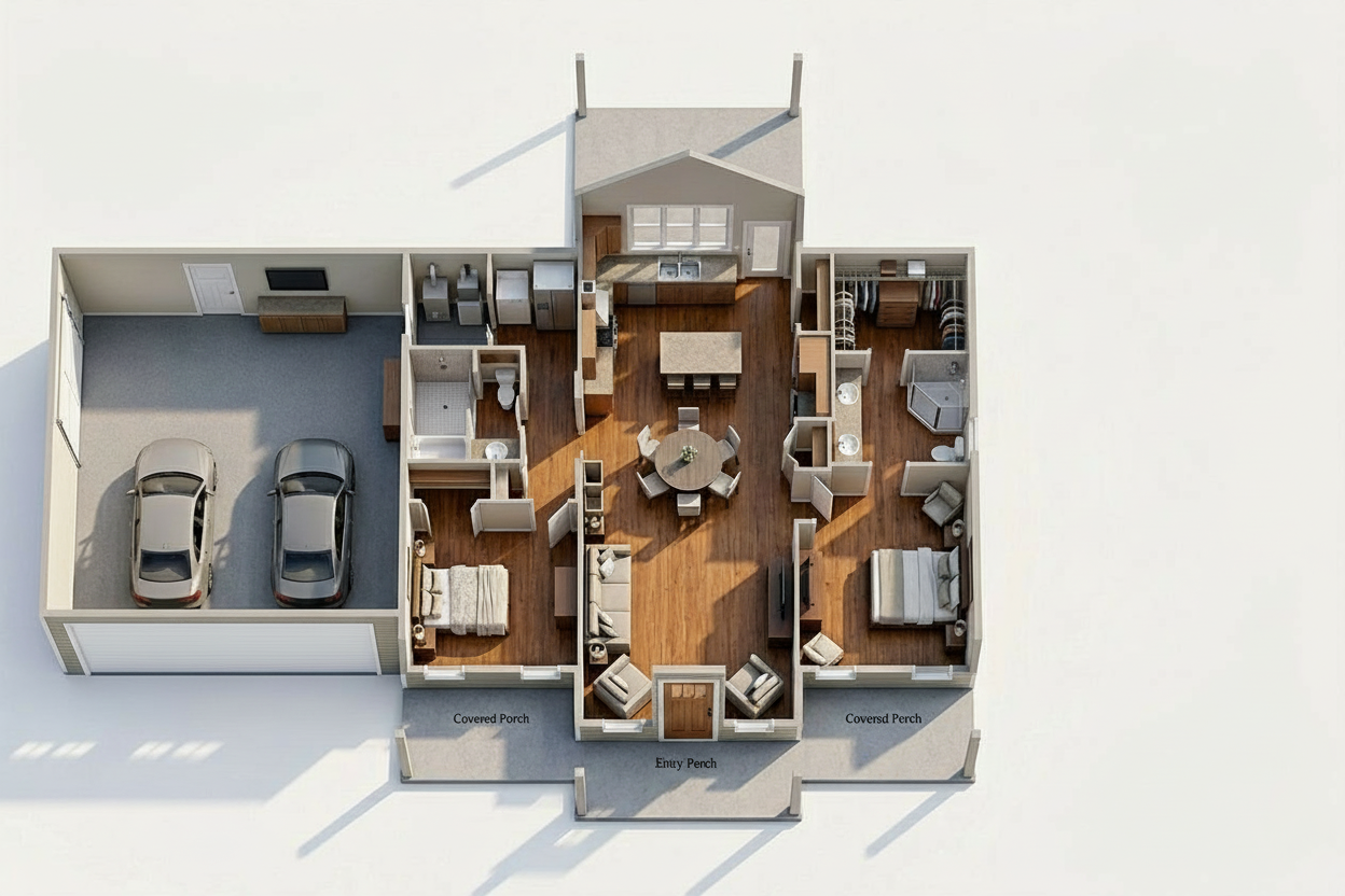 convert this floor plan into a realistic isometric 3d view of a full house show the space from an elevated angle with furniture walls and details visible do not ad any rooms that are not on this image change shower in bathroom on left to a neo angle shower use the same furniture as shows on the plan do not change the orientation of the floorplan