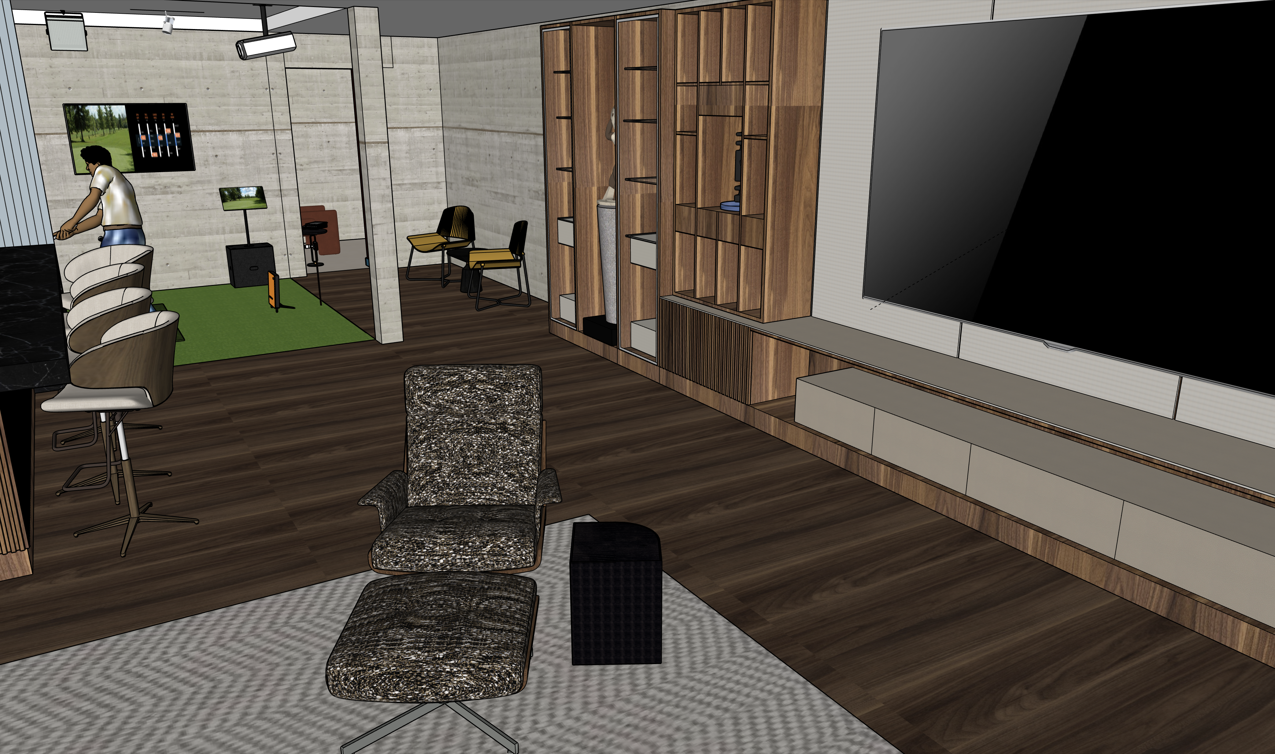 minimalistic contemporary residential design dark wood floor andreu world chairs vertical indirect lighting inside the library spot lights over lazy concrete wall wall mounted tall wine cooler taupe color soft rug golf simulation area