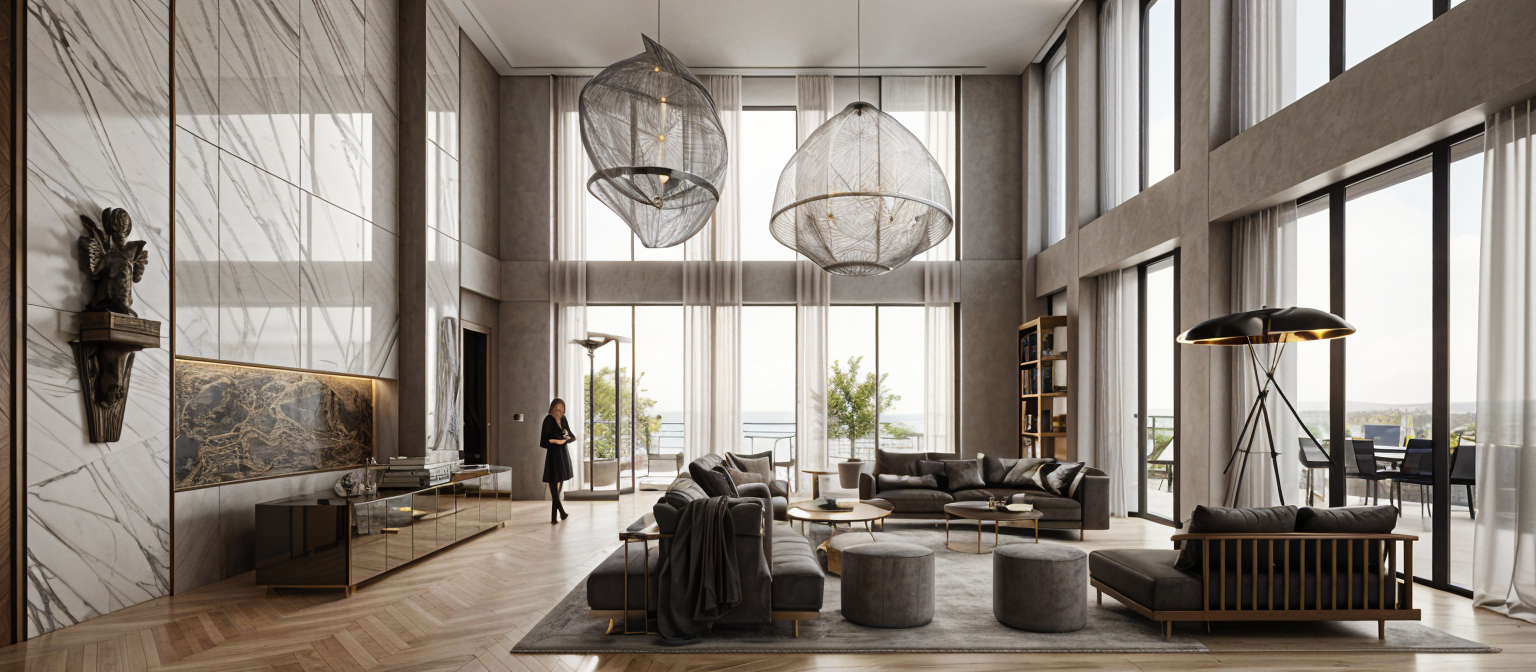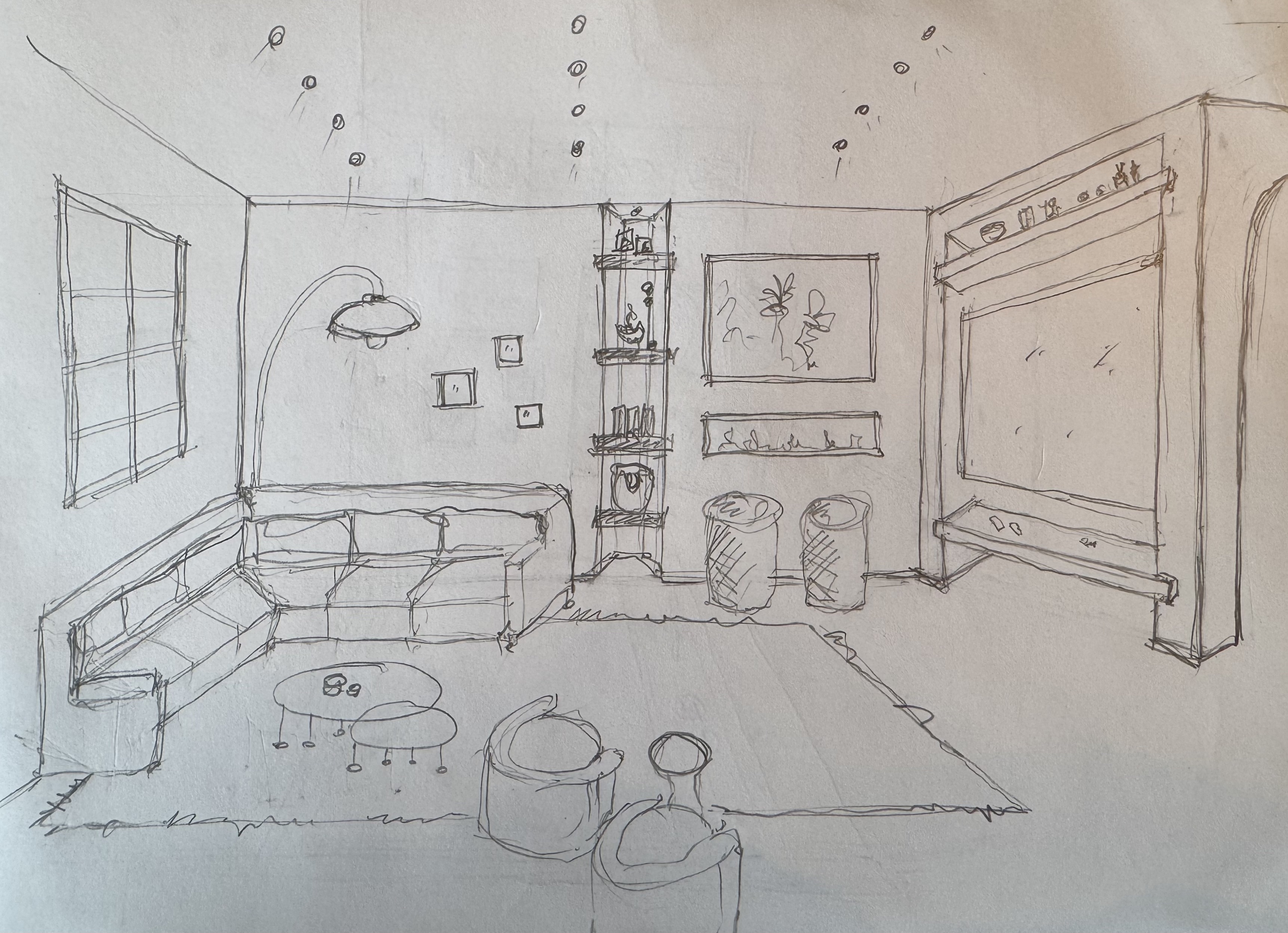 interior shot show a corner of a living room with a large tv and a wood shelf above and below it then the perpendicular wall has a narrow fireplace and art frames above it to the left of that is a floor to ceiling niece