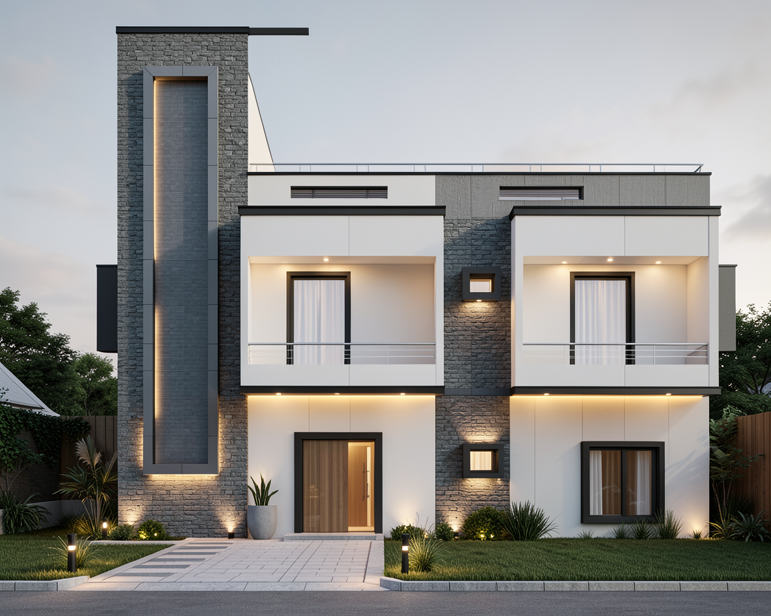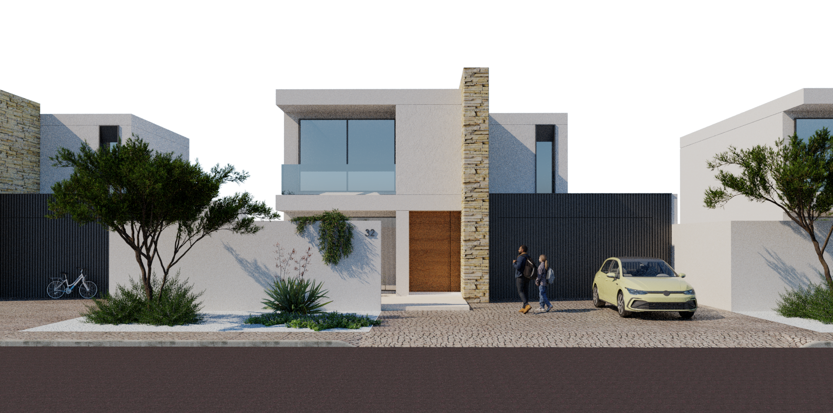 image type hyper realistic architectural render contemporary editorial style scene framing frontal orthogonal street level view of a modern mediterranean house symmetrical and centered composition with a calm balanced architectural reading camera at human height approx 1 60 m neutral lens 35 50mm no perspective distortion main elements single cubic residential volume with white stucco surfaces a vertical natural stone wall element dark vertical slatted gate and a recessed wooden entrance door upper floor with large window and glass railing one contemporary car parked to the right mediterranean vegetation olive tree low shrubs climbing plant on wall keep existing elements only foreground includes asphalt road and cobblestone pavement materials critical high fidelity asphalt uniform and continuous surface fine grain texture no visible noise or patchiness matte finish no reflections cobblestone pavement clear definition of individual stones subtle joints slightly irregular but controlled pattern matte and slightly porous natural tones low saturation white stucco perfectly consistent surface no imperfections or stains very subtle micro roughness only visible under grazing light clean and controlled finish natural stone wall horizontal layered stone warm beige tones soft shadowing between layers controlled relief no excessive contrast wooden door natural wood tone matte finish soft grain visible but not exaggerated black slatted gate matte black deep tone no plastic reflections glass soft reflectivity balanced transparency vegetation mediterranean vegetation with realistic volume and structure olive tree with slightly irregular canopy grey green leaves dry shrubs and ground cover subtle light interaction soft shadows healthy but restrained do not add or densify vegetation lighting mid afternoon mediterranean light warm lateral sunlight casting elongated but soft shadows across the fa ade and ground clear summer atmosphere with a subtle sense of heat no overexposure controlled highlights environment background minimal clean background with soft mediterranean context suggest distant gentle slopes and sparse vegetation very subtle and not competing with the architecture no dense forest color atmosphere warm natural tones slightly desaturated clean whites controlled contrast air feels dry and luminous avoid oversaturation and avoid heavy color grading style editorial architectural photography poetic calm highly visual inspired by high end architectural publications minimal elegant no artificial drama quality ultra realistic high resolution physically accurate materials pbr clean global illumination no noise no artifacts restrictions do not add new elements do not exaggerate textures do not oversaturate colors do not burn highlights avoid dramatic skies or overly stylized effects
