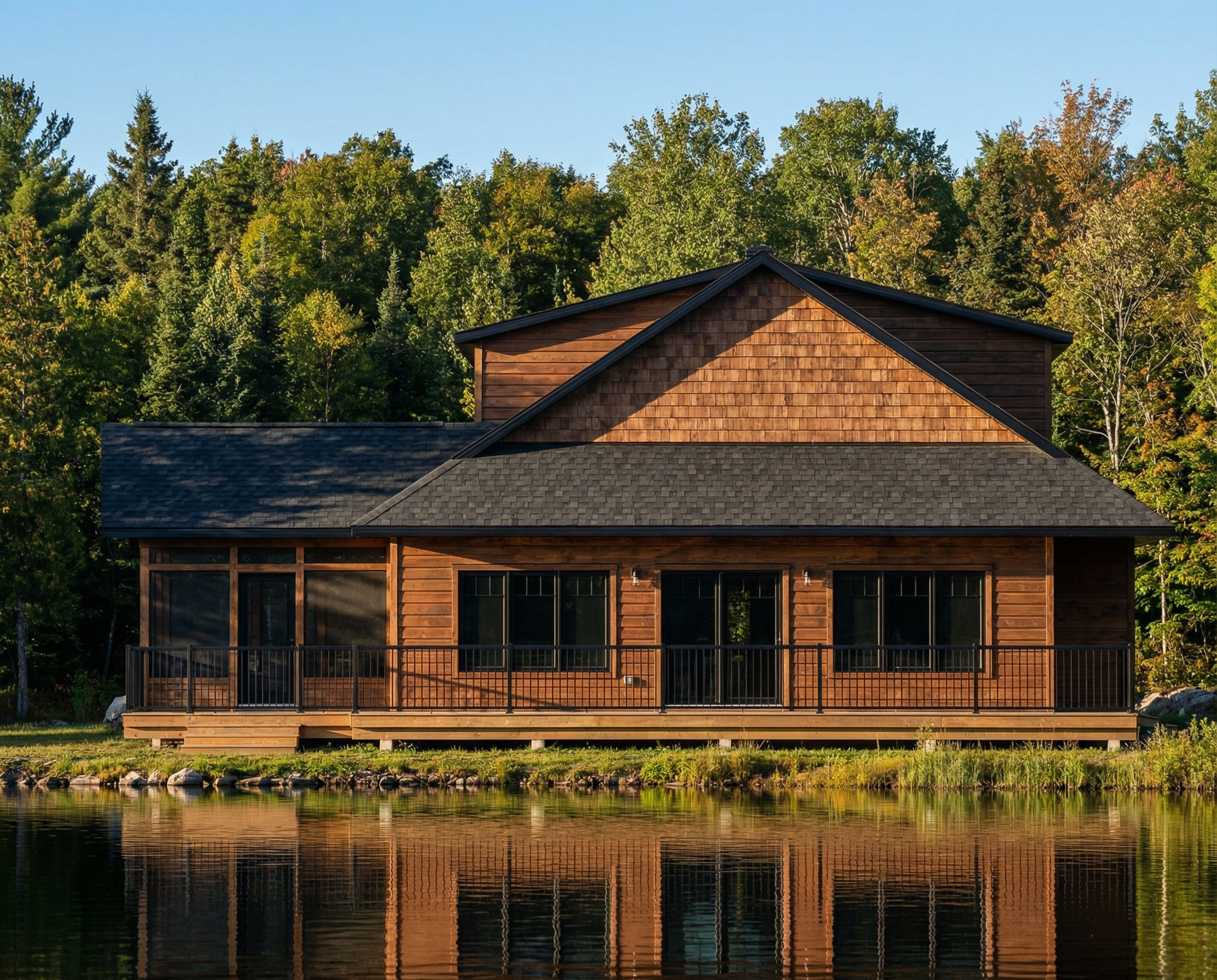 rustic brown wood siding deck on front with black railing black windows and shingles dense trees in background and lake in foreground with a bluff move dormers further back put square window in peak