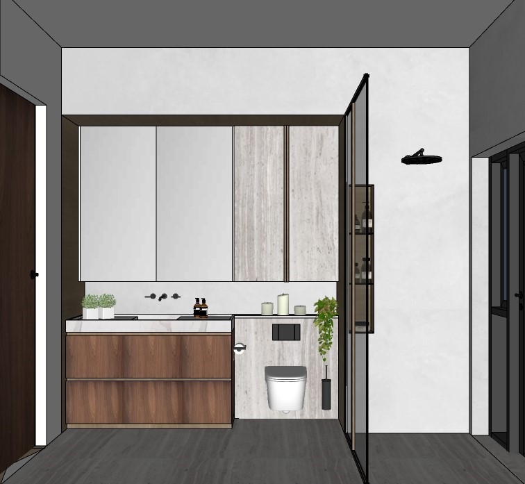 put led lighting strips on each side of the mirror and underneath the cabinet also put led lighting vertical inside the shelf in the shower