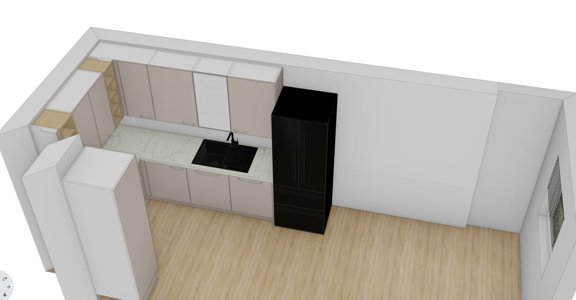 a modern kitchen with a minimalist design cabinets are a soft beige with chrome handles while open shelving uses light oak countertop is white marble with subtle grey veins the sink is matte black matching the sleek black refrigerator walls are a light grey and the floor is composed of light oak wood planks the atmosphere is bright and airy with natural light streaming in from a window casting soft shadows that add warmth and depth to the space