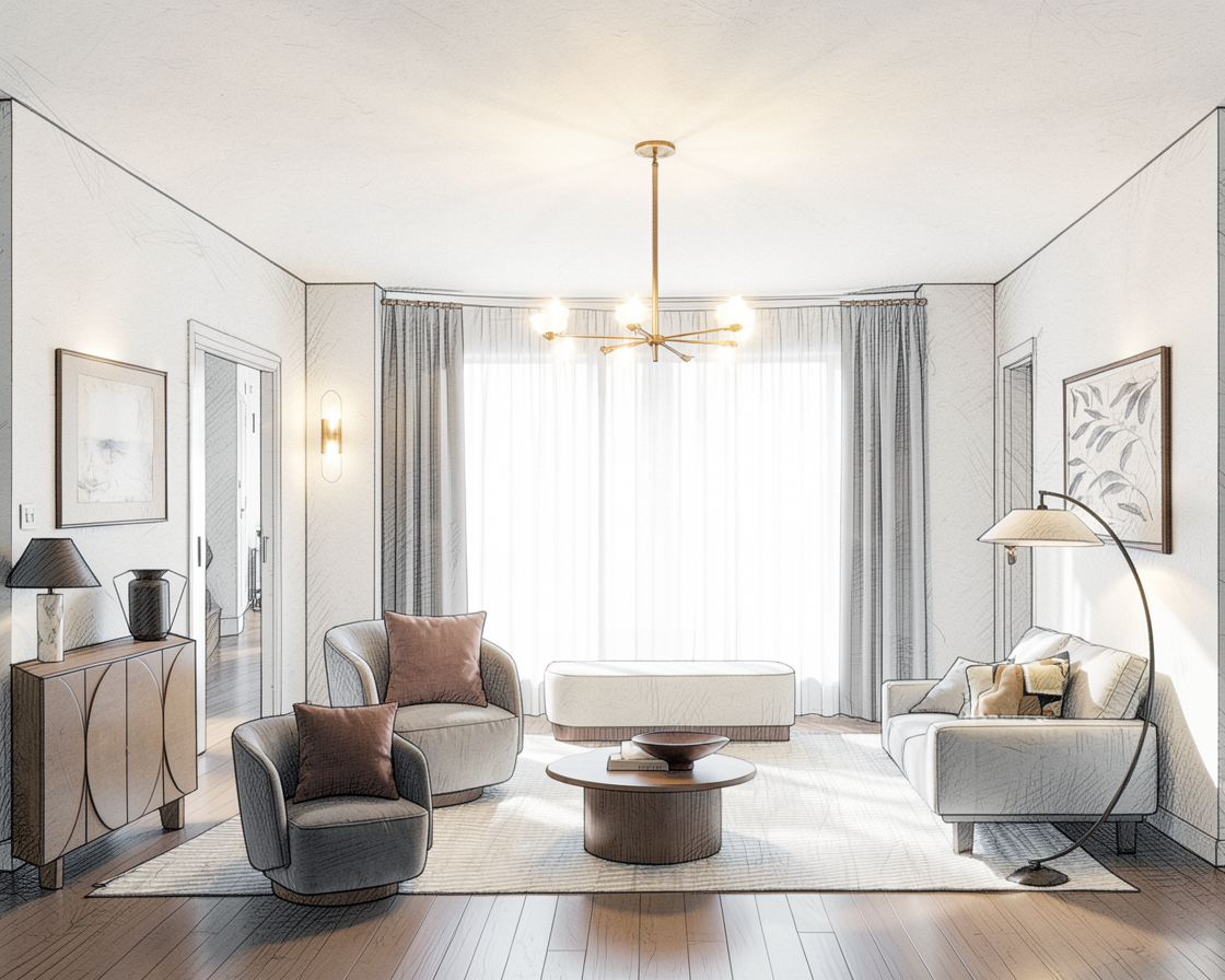 genau dieses rendering berarbeiten fotorealistisches innenraum foto exakt dieselbe perspektive und kameraposition wie das hochgeladene referenzbild 100 identische raumgeometrie exakt gleiche m belanordnung exakt gleiche verlegeart und richtung von platten wie vorlage exakt identische fensterpositionen mit gleichem ausblick durch die fenster weiches nat rliches tageslicht leicht schr g einfallende sonne durch die grossen fenster geschlossene r ume k nstlich ausleuchten sanfte realistische schatten blickrichtung ist nach norden sonnenlicht kommt von westen realistische materialien echte holztexturen stoff mit leichten gebrauchsspuren hochwertige oberfl chenreflexionen kleine gr npflanzen blumen in vasen auf tischen einbauen nat rliche farbwiedergabe leicht warme farbstimmung golden hour feeling das bett ersetzen mit einem modernen schlafsofa sessel hinten passend ebenfalls ersetzen esstisch in einer modernen variante ersetzen decke mit weissputz ersetzen das bild muss wie eine professionelle fotografie aussehen es soll ein echtes und reales foto sein canon eos r5 35 mm festbrennweite f 2 8 hyperrealistisch dslr qualit t raw aufnahme 8k aufl sung extrem scharf perfekte tiefensch rfe professionelle architekturfotografie