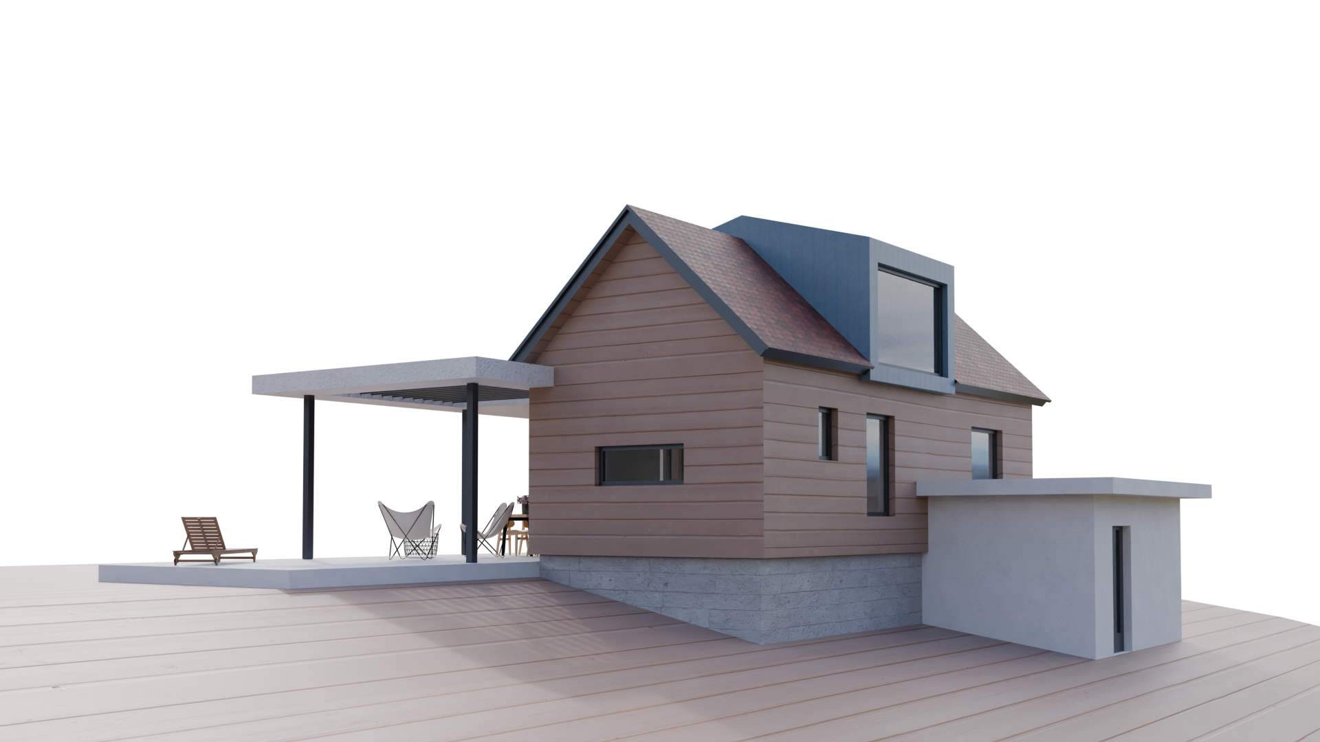 render a photorealistic 3d perspective of this house in rural setting next to tall pine trees in the background of the attached picture reference the current material style just enhance all used materials keep model geometry the same windows doors roof walls terrace make a natural lawn setting on terrain geometry in attached picture that looks native to croatian zagorje region do not change the view only enhance the current materials and make the landscape nicer vegetation detailed textures in the wood siding and glass reflections and a vibrant clear sky with light atmospheric depth render in hyper realistic architectural visualization quality 8k resolution