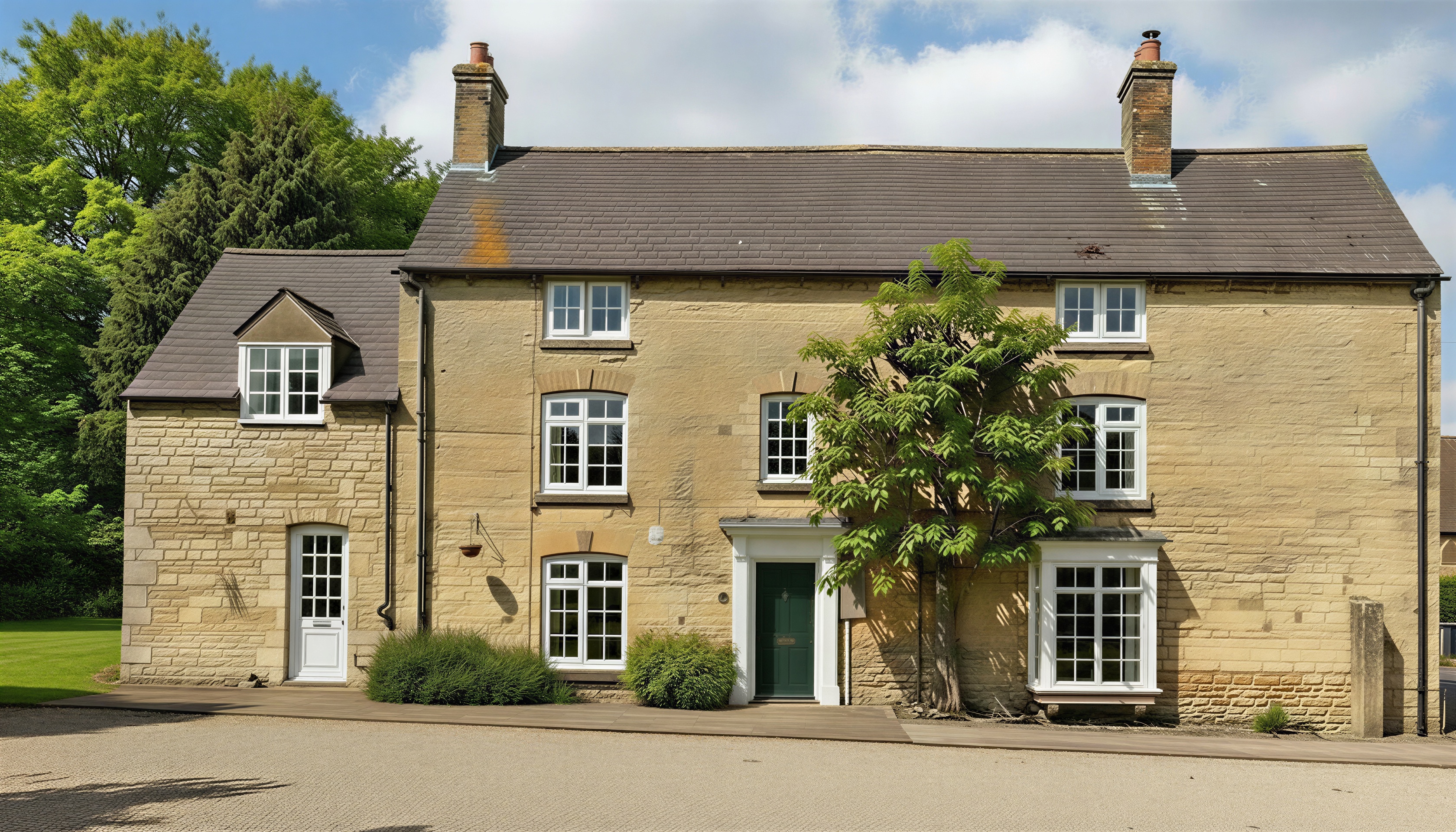 exterior shot change the bay window arrangement to exactly like the moodboard keeping everything else exactly the same as the source image