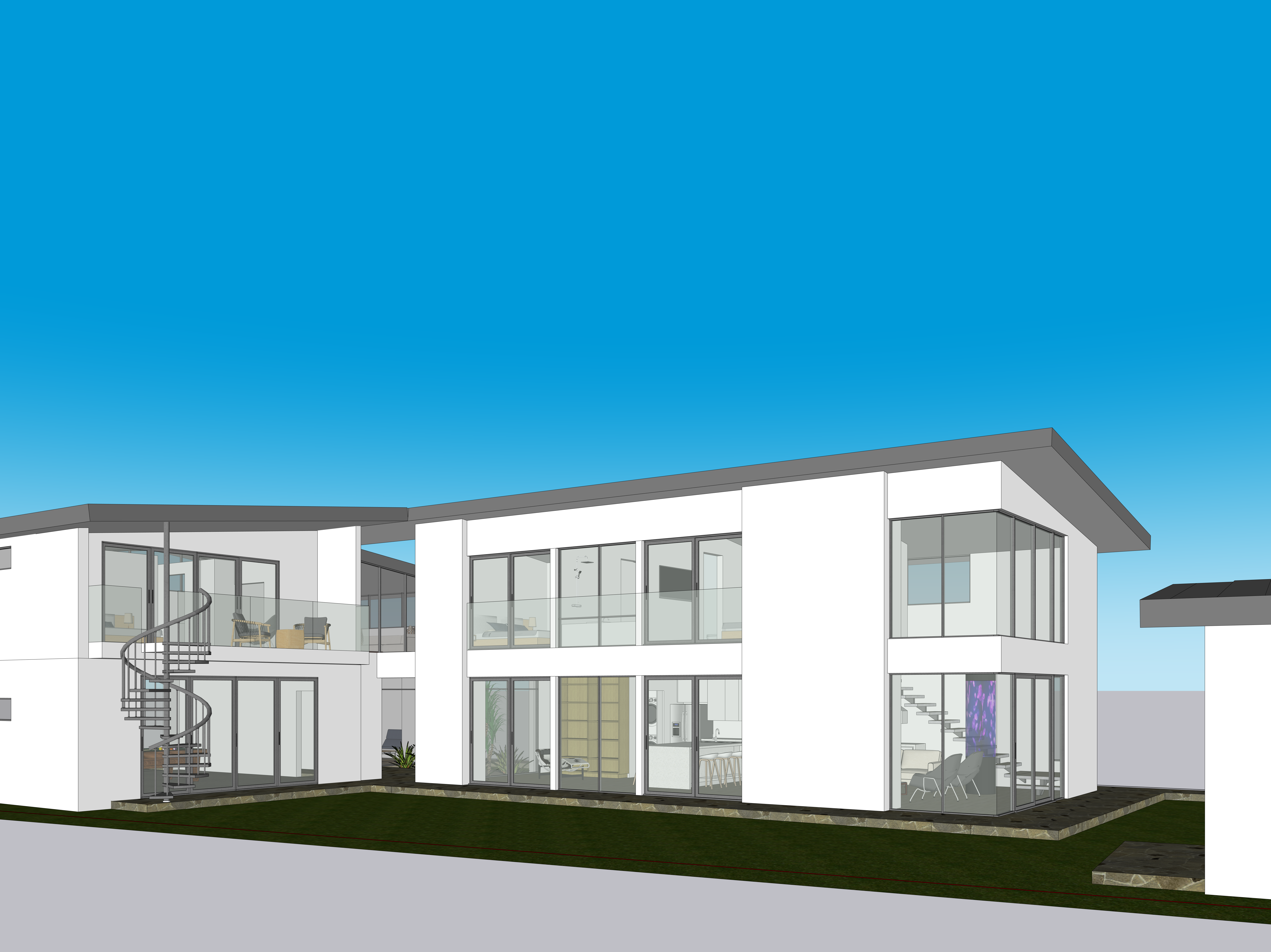 afternoon view add a woman inside the house on the ground floor add a man and a woman sitting on the terrace on the second floor at the left side of the view add a girl and boy playing in the yard in the foreground add los angeles drought landscape around the house keep the perspective view angle from the source image