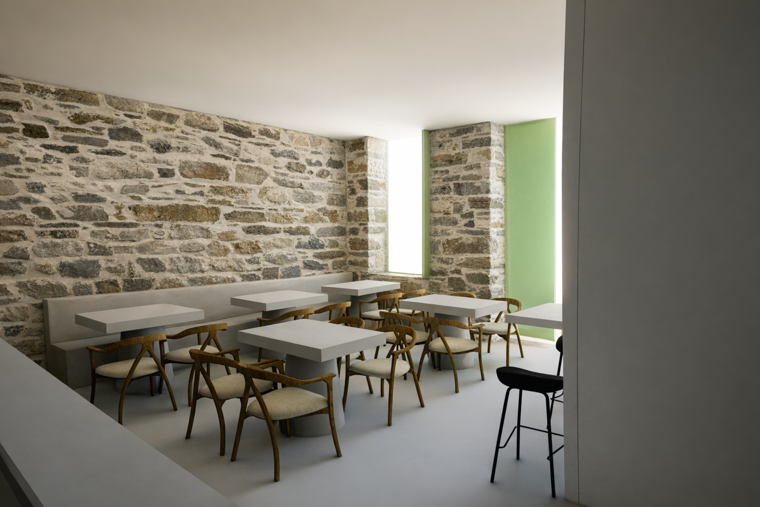 i want you to transform this space for me with the same layout it has into a modern and minimalist restaurant in which beige white and a few tones of green will prevail keep the stone on the wall
