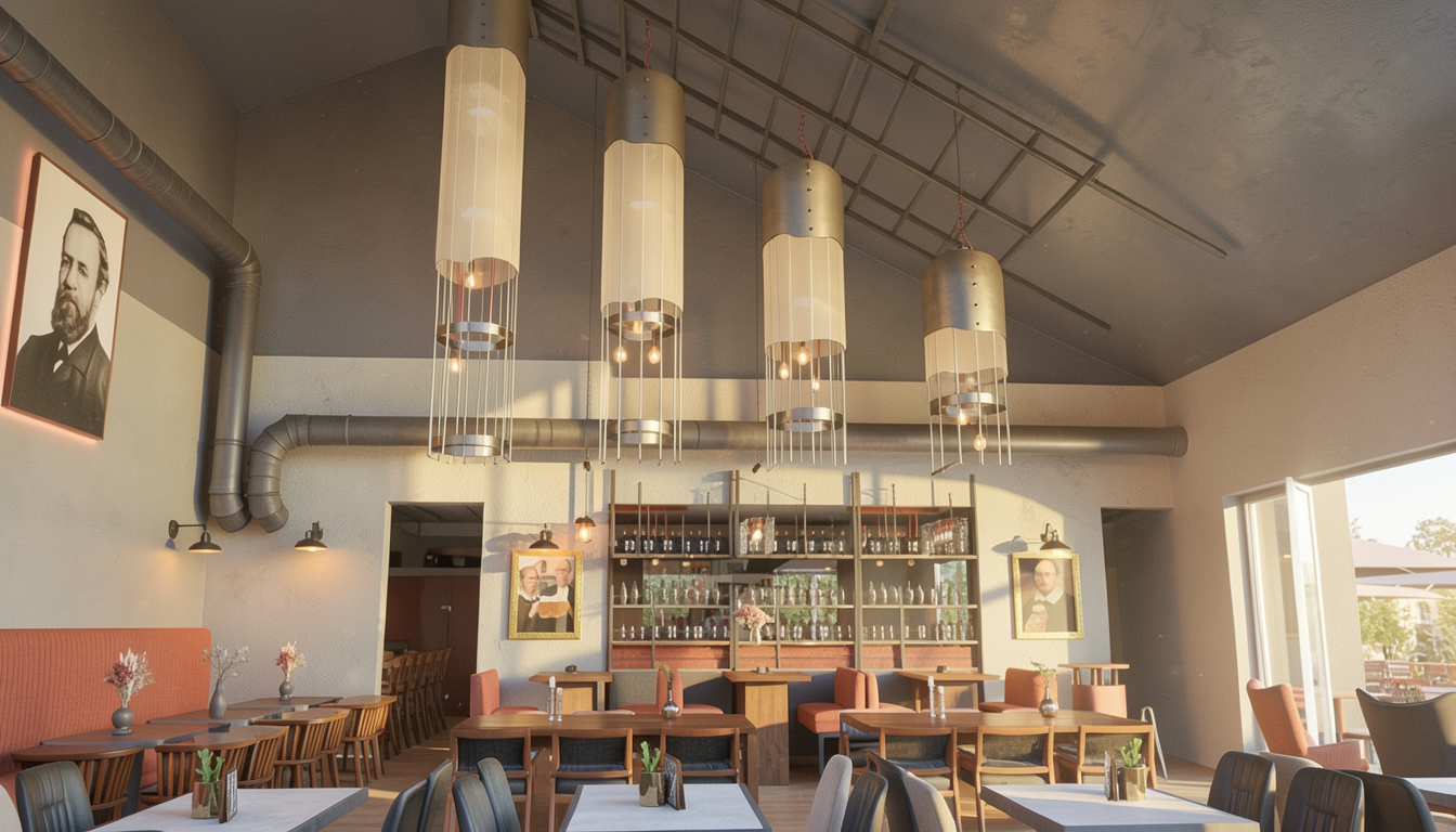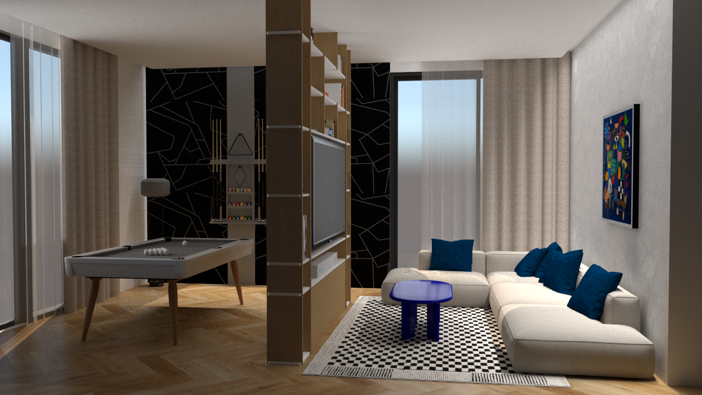 add some spotlights in the ceiling indirect light abose sofa and above the wallpaper wall the floor lamp has a smoked glass dome outdoor has a boundary wall and some potted plants
