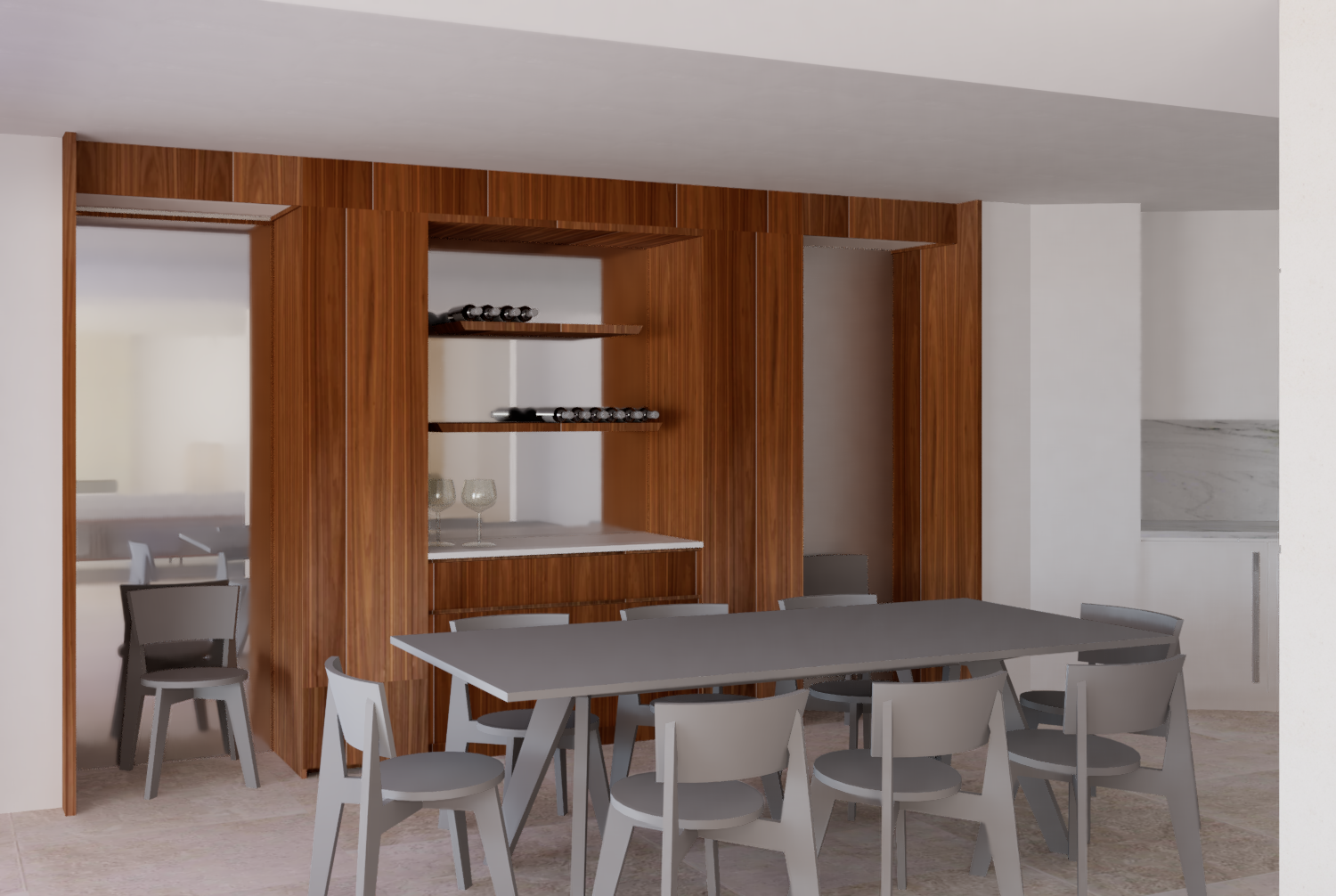 render a modern dining room with a sleek minimalist atmosphere the room features a long dark gray table with matching chairs the backdrop is a rich warm walnut wood paneling at the wet bar providing an elegant contrast the walls are a subtle off white adding a soft neutral tone the lighting is soft and ambient casting gentle shadows to create a cozy and inviting space accentuate the room with a few wine bottles on the shelf and two clear wine glasses on the counter the overall mood is sophisticated and contemporary