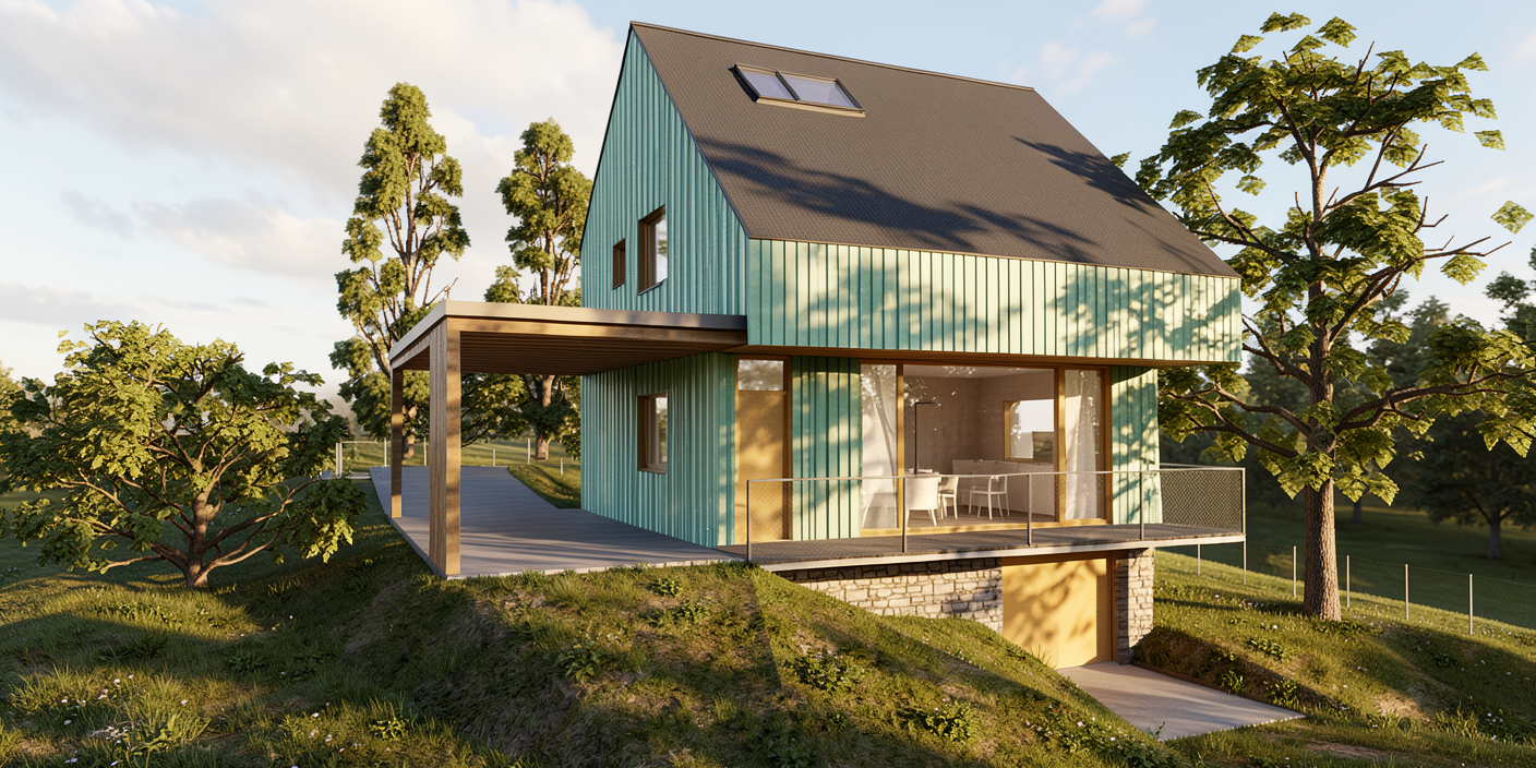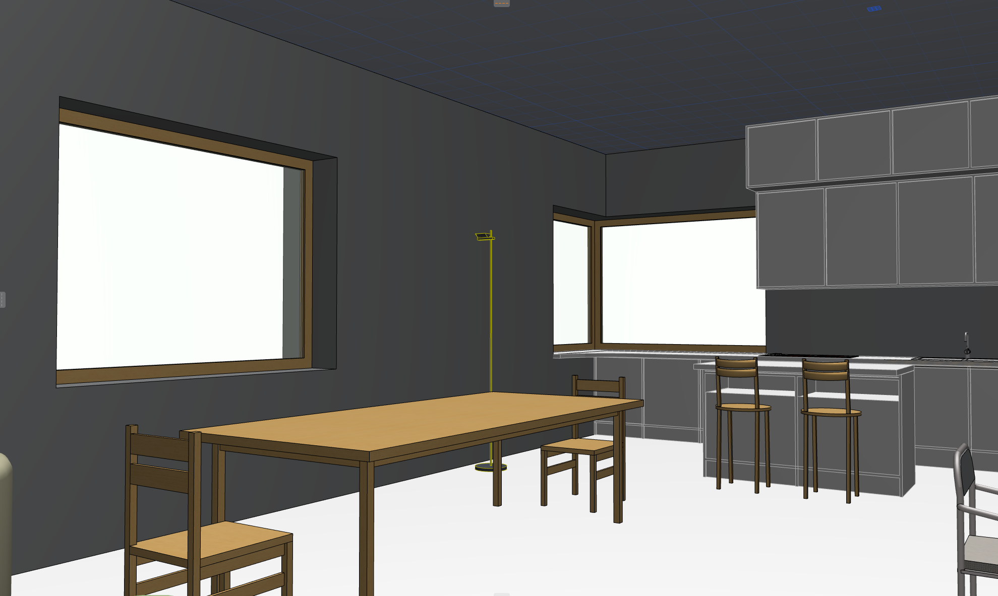 photorealistic interior render strictly based on my provided 3d model and the exact camera view keep 100 the same geometry proportions dimensions cabinet layout island size wall openings door positions and appliance locations do not crop do not zoom do not change perspective do not change field of view apply the same color palette and finishes as the reference kitchen warm dark walnut smoked oak wood cabinetry with visible grain minimalist flat panels thin shadow gaps handleless design add warm integrated led strip lighting under the upper cabinets and inside the open shelf niches exactly like the reference mood use light beige travertine stone matte honed for the kitchen countertop island countertop and the full backsplash wall panel with realistic pores and subtle natural veining place a dining table exactly like the reference design rectangular wooden tabletop in matching warm wood tone two vertical ribbed fluted wooden base panels and a thin black metal detail under the tabletop keep the table size placement and perspective consistent with my 3d scene high end architectural visualization soft warm daylight realistic shadows ultra detailed materials clean minimal styling