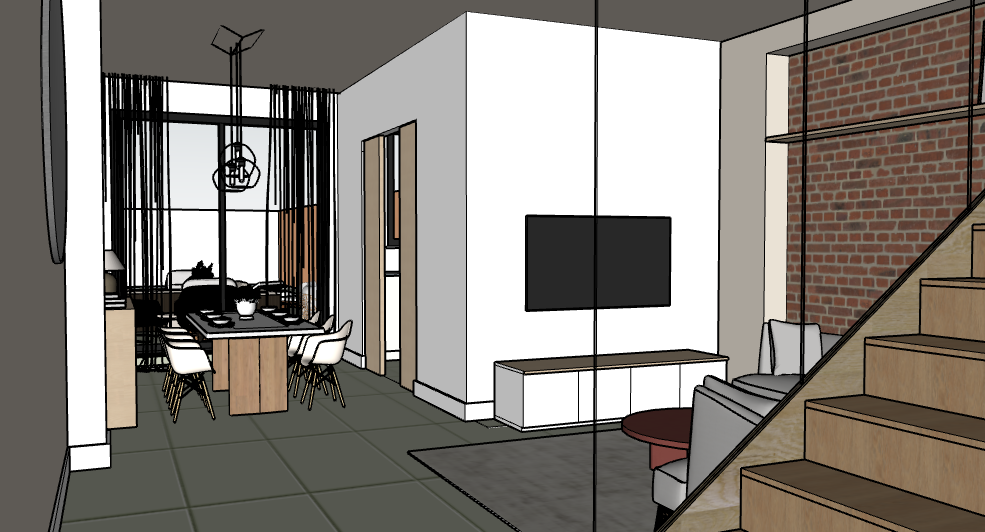 modern interior living space featuring a minimalist dining area with a natural oak wooden table and sleek white eames style chairs the table is set with a simple elegant centerpiece in the living area a contemporary grey sectional sofa complements a round deep red coffee table placed atop a subtle grey rug the entertainment unit is minimal and white blending seamlessly with the white walls the exposed red brick accent wall adds warmth and texture the staircase is crafted from light oak matched with sleek black metal railings soft natural light filters through floor to ceiling black sheer curtains creating a cozy yet sophisticated atmosphere the floor is a dark slate grey tile unifying the open plan space