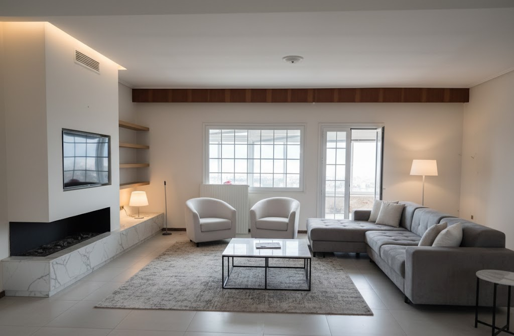 render a beautifully renovated room with elegant and modern aesthetics bright serene color palette walls painted in soft ivory polished wooden floor in warm oak tones replace the damaged wall area with a chic built in fireplace in sleek matte black install large transparent windows framed in minimalist white allowing ample natural light add plush light gray curtains to enhance the cozy atmosphere include a stylish ladder shelf with books and decor accents the ambiance is calm inviting and luxurious a perfect blend of contemporary style and comfort