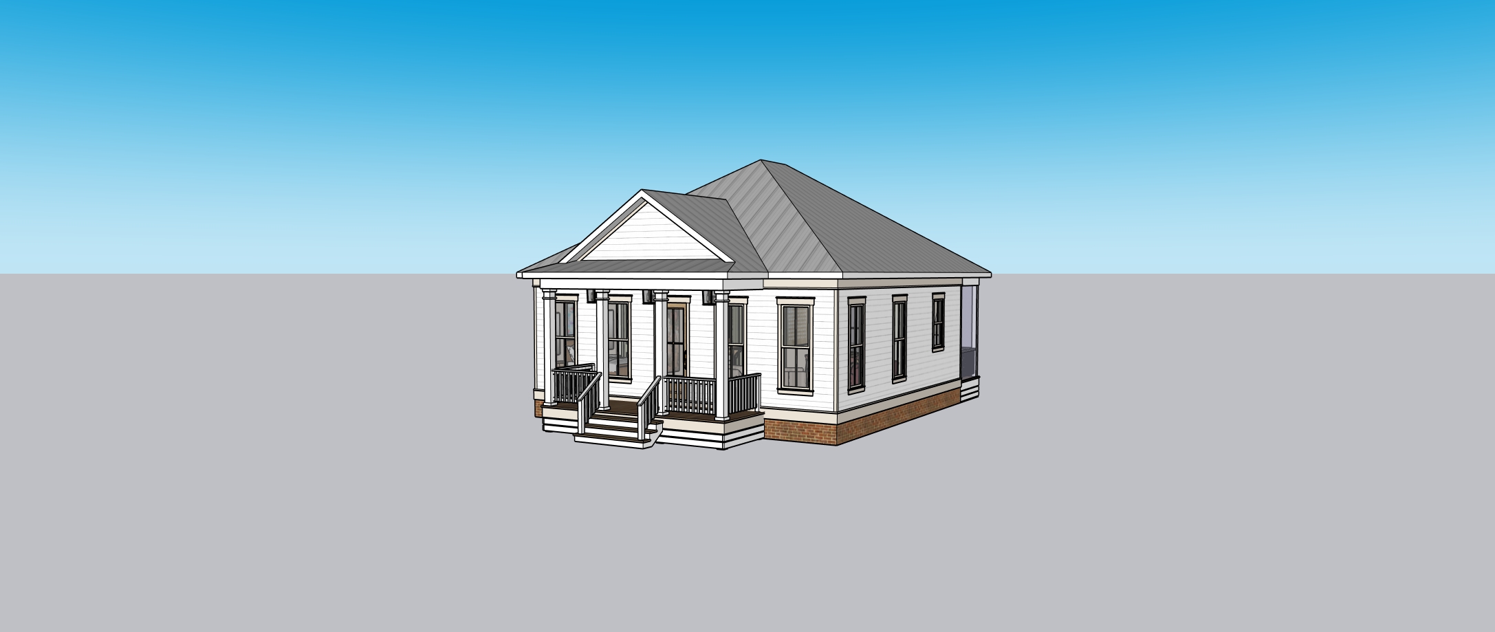 render to make look realistic maintaining the overall structure and properties do not add anything extra to the building keep the windows and door in the same place do not add any additional roof from what is in the picture white horizontal siding white posts and railing white horizontal boards under the deck red brick skirt white windows rear screened in deck gray metal roof place in a serene private atmosphere with a few surrounding trees simple landscaping and blue sky