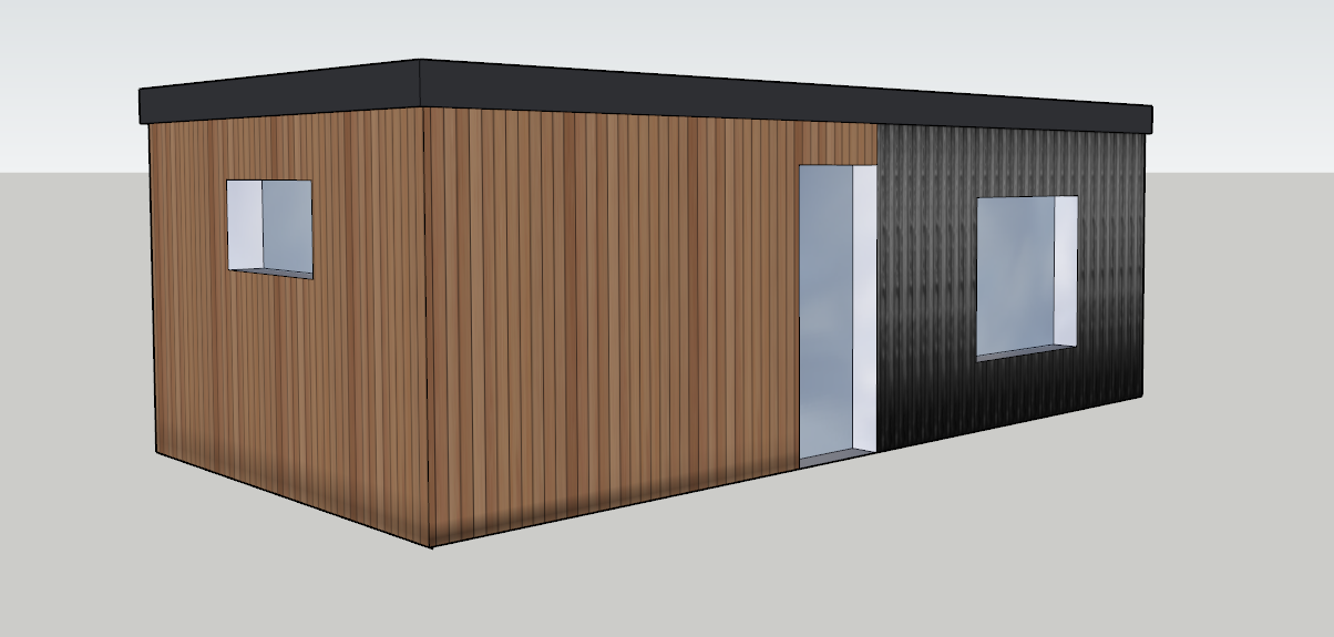 dark charde wood black with a larch sladding to the front window with glass and a front door frosted with black framr and handle create a backround in a garden setting