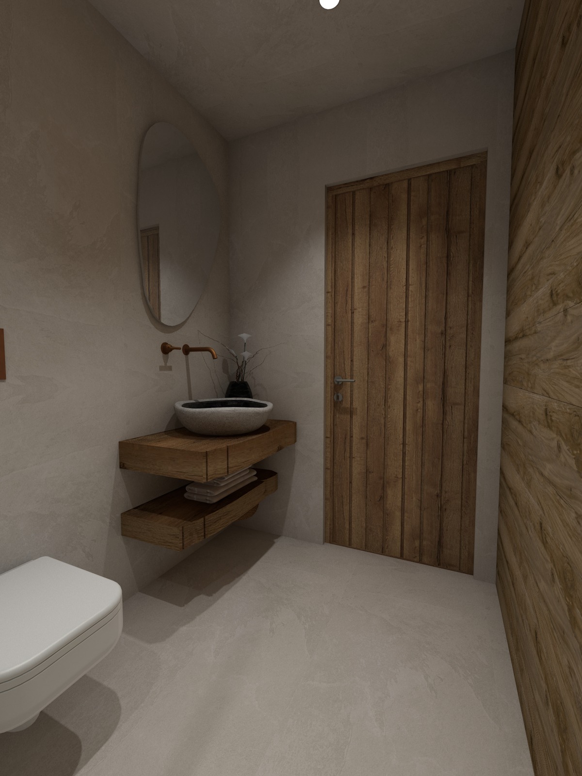 overall mood earthy serene calm spa like atmosphere natural materials gentle colors soft light no dark tones and the right wall has wood tiles satine like tiles daylight design the vanity with a thick raw edged wooden countertop made from natural unfinished wood with visible grain natural rustic effect vase on the counter with big natural flowers important the unmorph mirror must have integrated soft perimeter lighting all around backlit glow