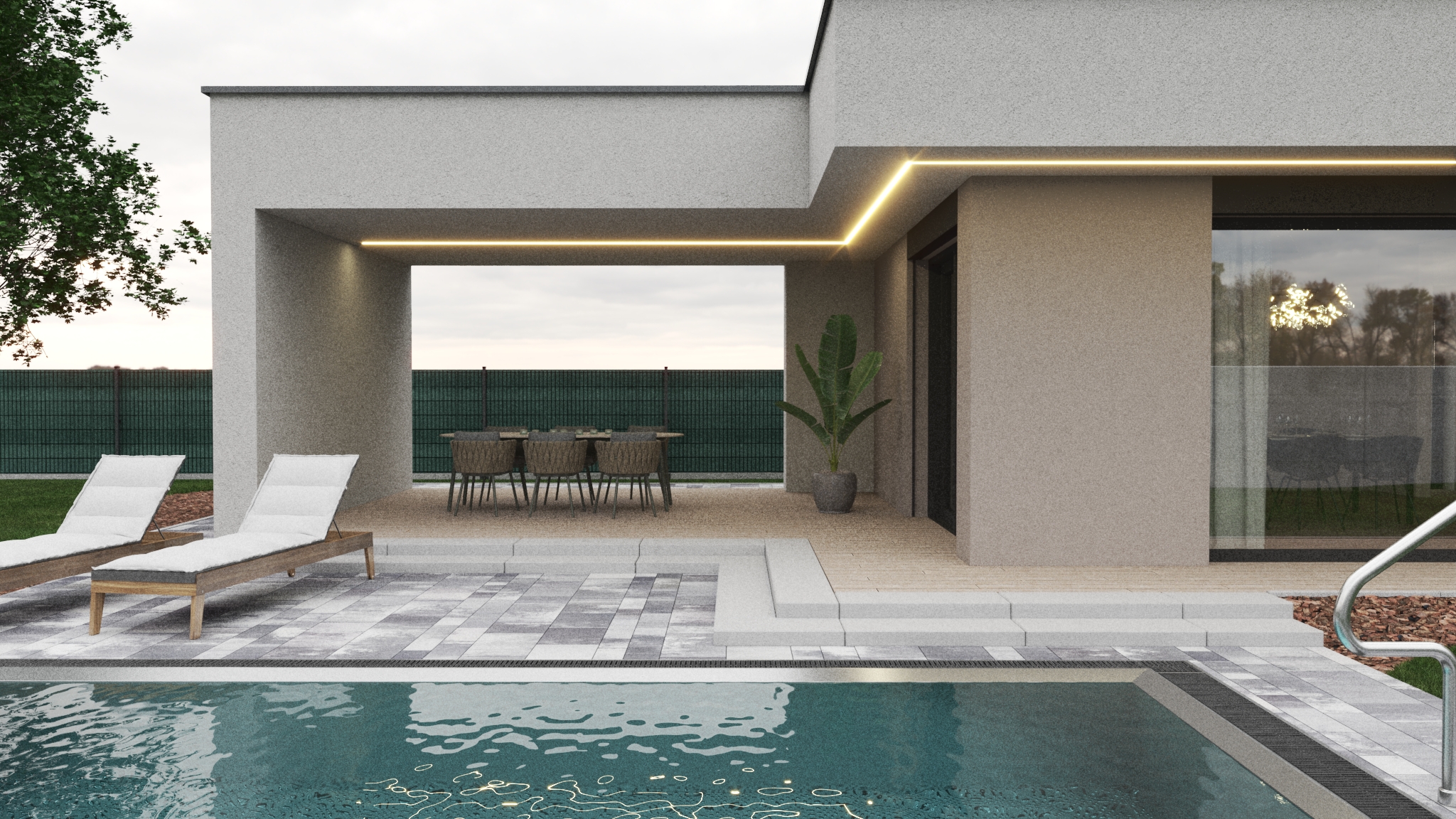 render a photorealistic 3d perspective of this house in a slovakia reference the current material style just enhance them keep model geometry the same windows doors roof walls garage door pavement driveway make a lush vegetation that looks native to truckee ca do not change the view only enhance the current materials and make the landscape nicer vegetation detailed textures in the wood siding and glass reflections and render in hyper realistic architectural visualization quality 8k resolution