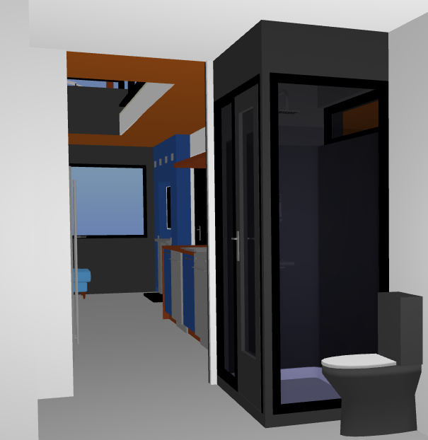 this a small modern tiny home this perspective is from the corner of the bathroom featuring the glass shower with large matte black tiles and a modern toilet lighting is golden hour with a light glow in the bathroom from soft led lighting