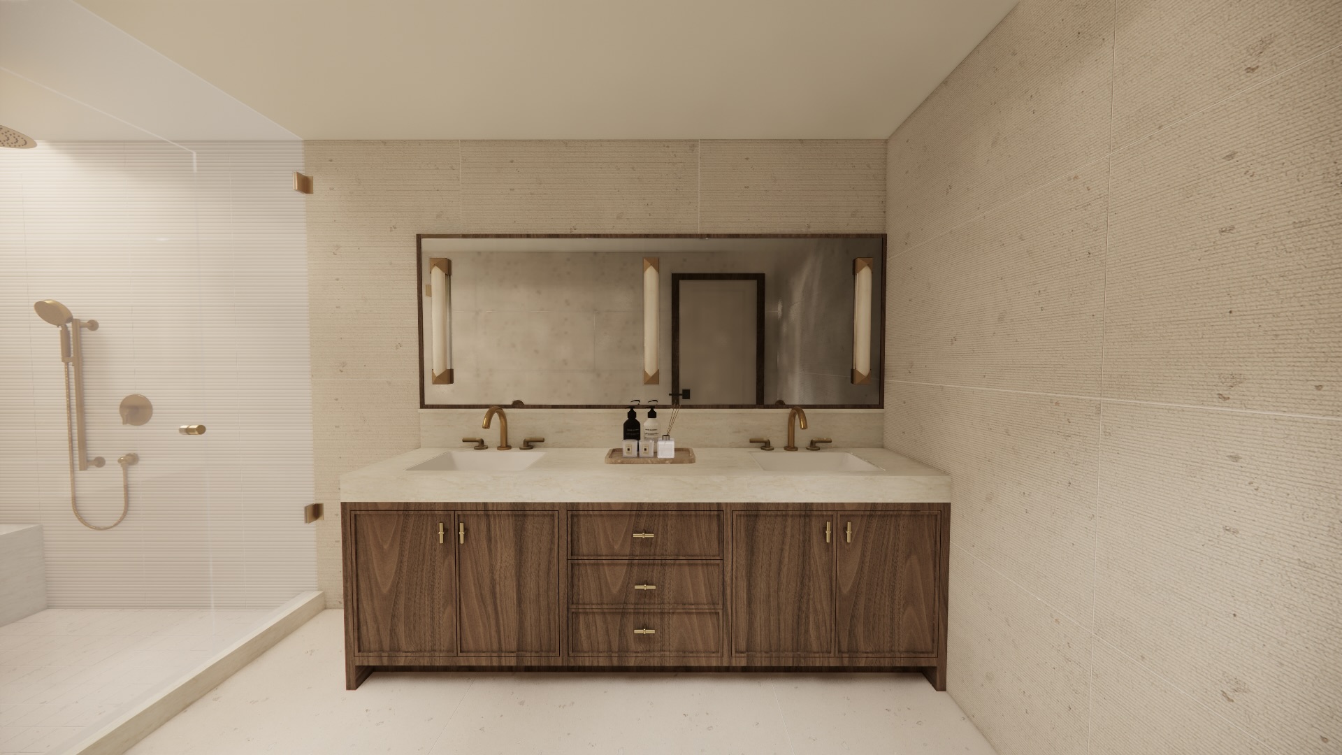 maintain floor and wall colour and texture make shower glass realistic add light to sconce