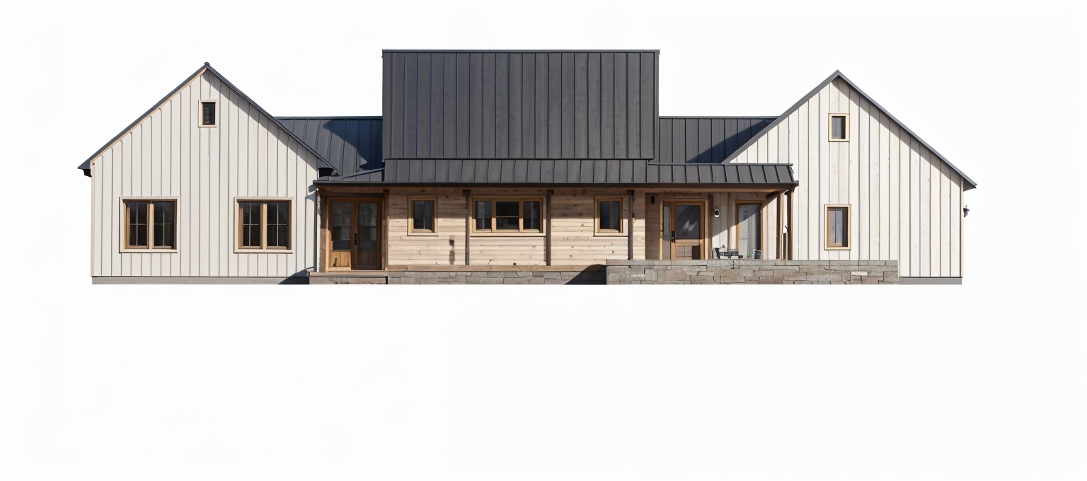 white stone veneer walls dark charcoal slate roof dark gray window mullions and frames smooth white limestone veneer at entry porch lush landscaping with flowers bushes and trees medium gray color for board and batten siding on second floor background trees native to tennessee