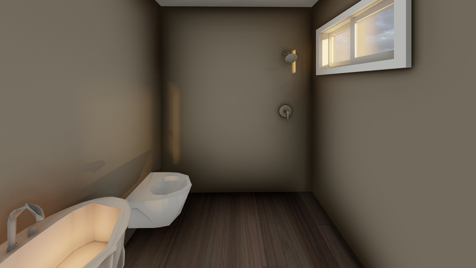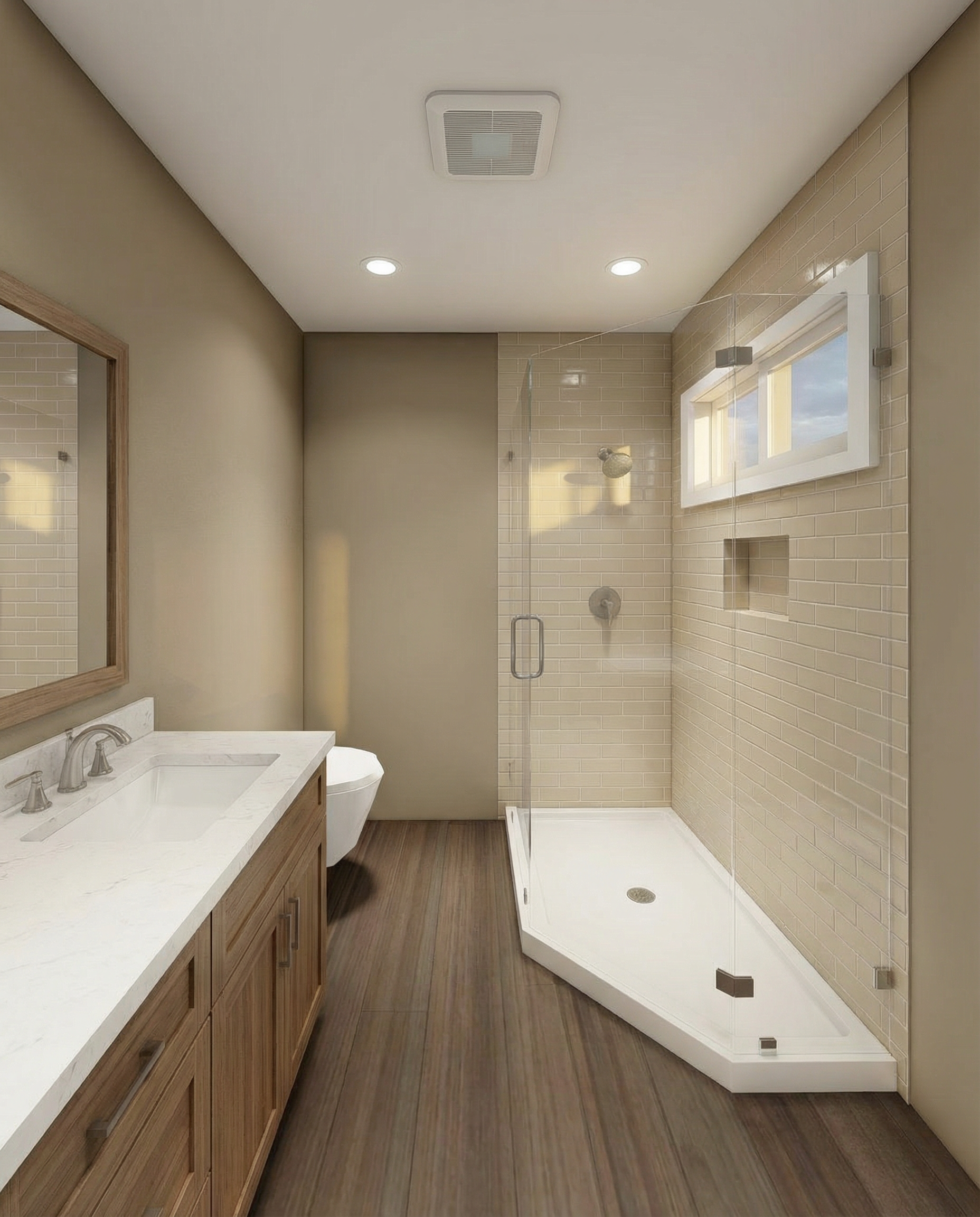 master bathroom maintain size of bathroom and location of items make shower on the right with glass enclosure shower will be curbed add a shampoo niche under window add 2 recessed lights and humidity fan vanity is single sink make bathroom look farm house modern vanity is small