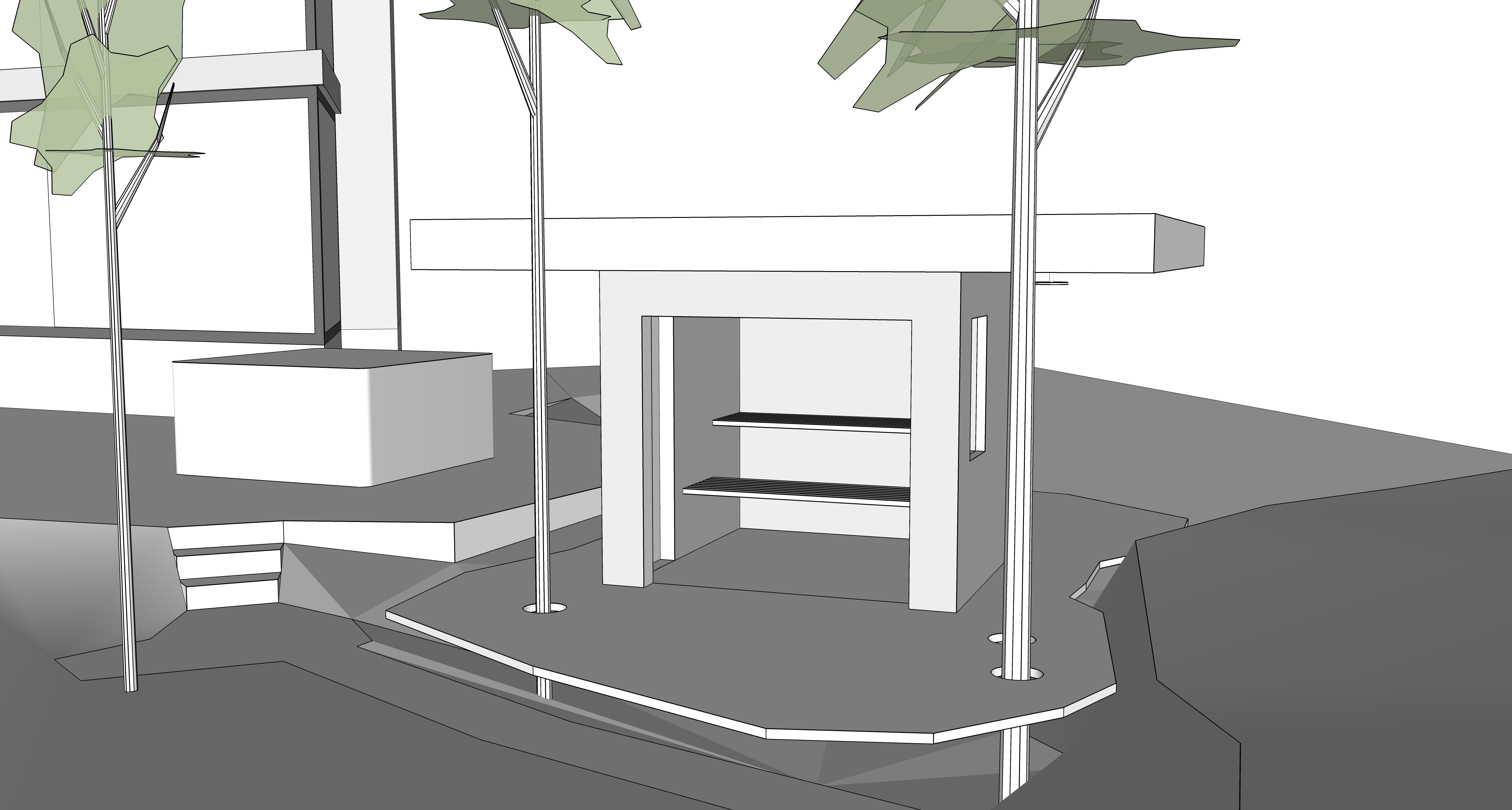 a photo of a beautiful and simple scale model all made of cedar wood there is a building in the foreground with a deck which wraps around and has holes cut out for trees to grow through the facade of this building has vertical wood slat cladding in the background is a modern structure with large glass windows the background of this model is empty white space the trees and the entire model are made of the same cedar wood