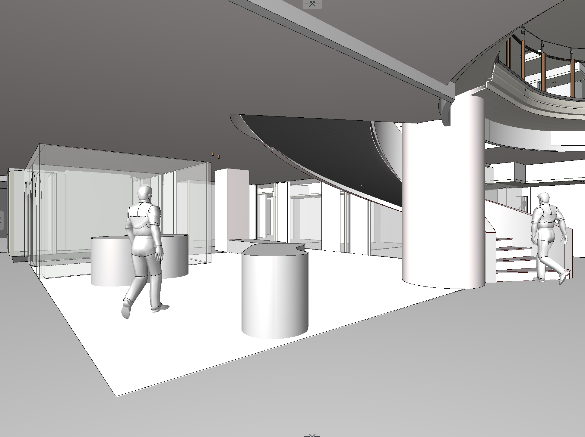 white model study artificial soft lighting white ceiling off white terrazzo tiled floor show glass walls to the consult rooms stairs should all read as types of white