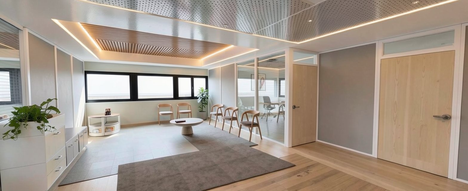maintain geometry le faux plafond de la salle d attente est en lattes de bois parall le aux fen tres les menuiseries des fenetres sont noires les structures des cloisons mobiles et vitr es sont blanches les diff rents sols sont tous au m me niveau le plafond du couloir est blanc mat m tallique perfor et ne brille pas et de chaque cot du plafond m tallique des bandes led sont allum es les 3 cloisons pleines sur la gauche sont gris mat clair et les montants sont blanc les cordons des suspensions sont beige il n a pas d clairage dans le faux plafond bois de la salle d attente sauf les trois suspensions clair es le mur du fond est peint en vert c ladon clair