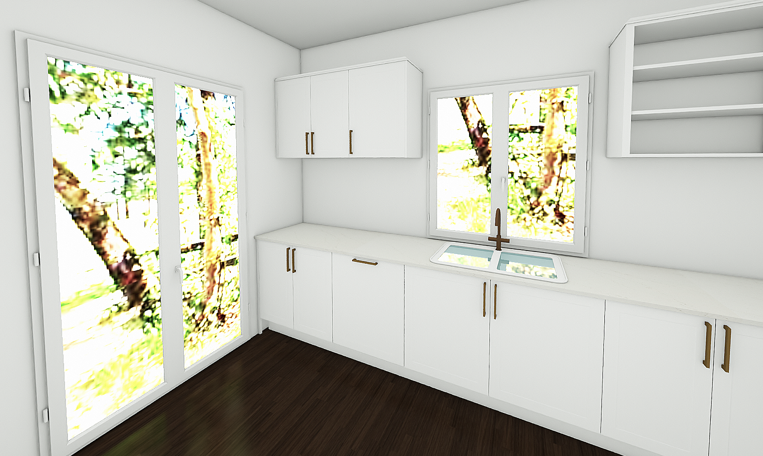 turn this butlers pantry into a full render don t change cabinetry style change window view to a better deck backyard