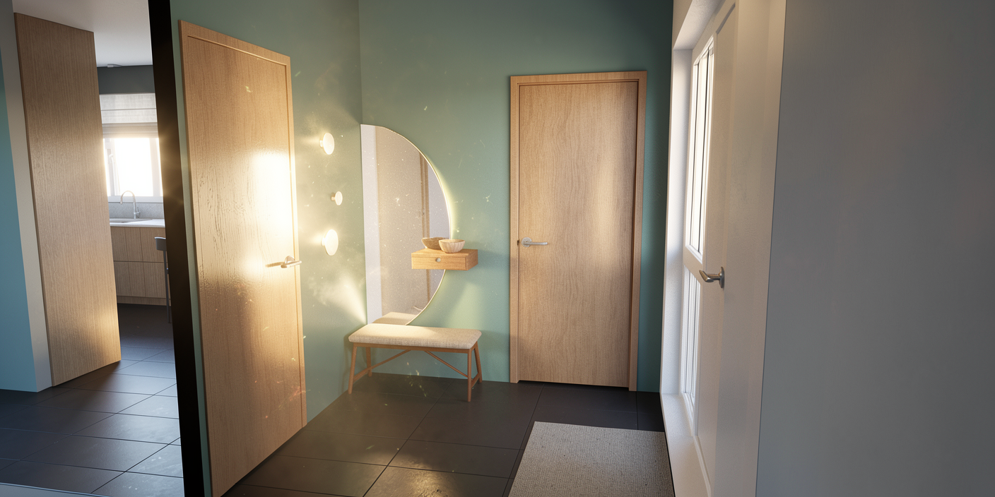 bright overcast daylight atmosphere soft neutral natural light 5500 6500k evenly diffused sky illumination clean architectural daylight mood no dramatic sunset tones balanced exposure natural contrast large glass surfaces with realistic daylight reflections of sky and surroundings transparent but slightly reflective glazing no strong glare no harsh highlights light atmospheric dry pavement with soft light bounce and mild reflections physically accurate global illumination photorealistic architectural visualization calm contemporary mood crisp details neutral color grading high dynamic range professional architectural photography style