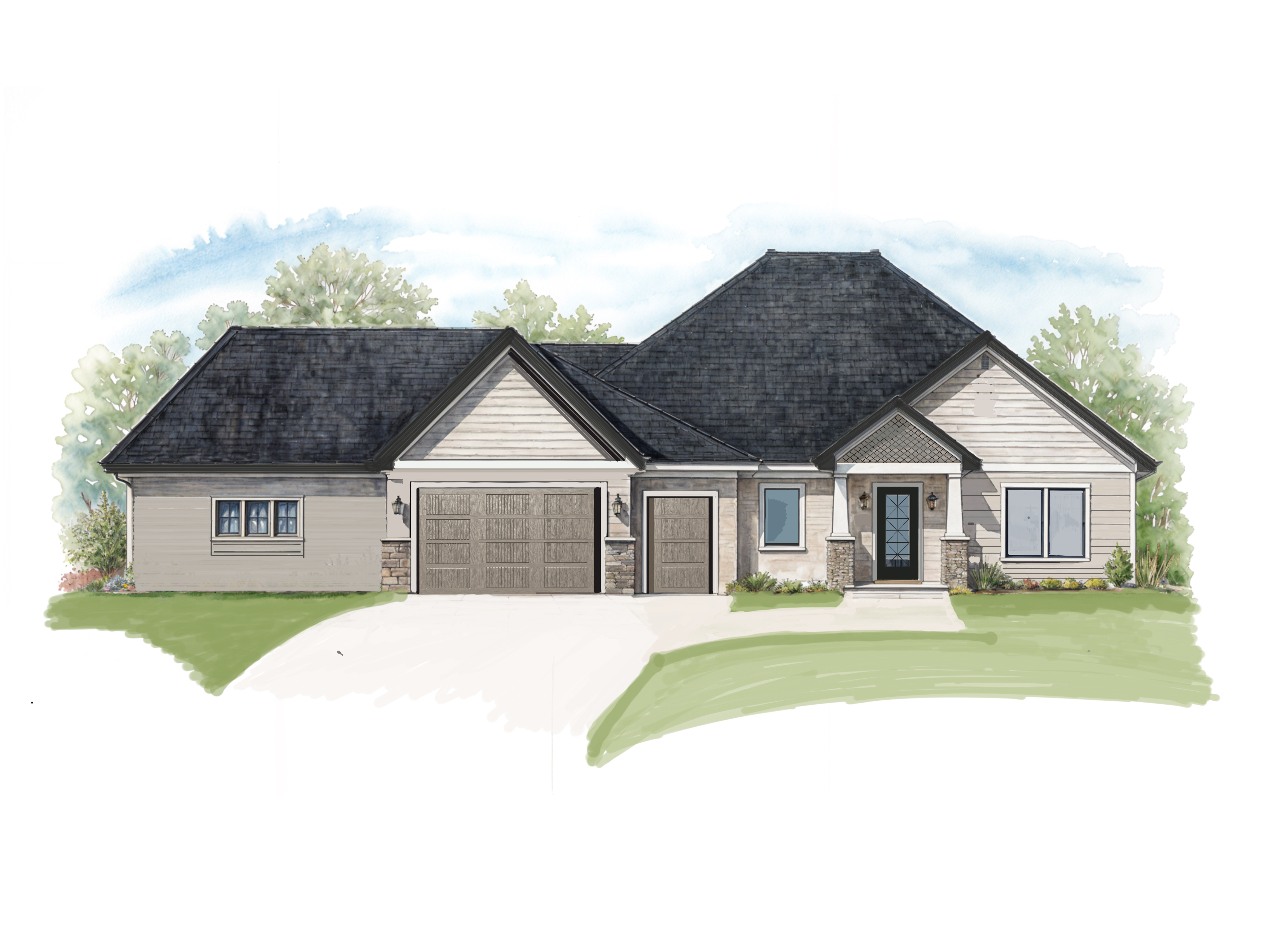 please make suggestions how to improve this home without changing the roof at all the elements of garage doors and sentry door locations are also not able to move please show a few variations of how this home could look the garages are angled off from the straight house front make watercolor looking